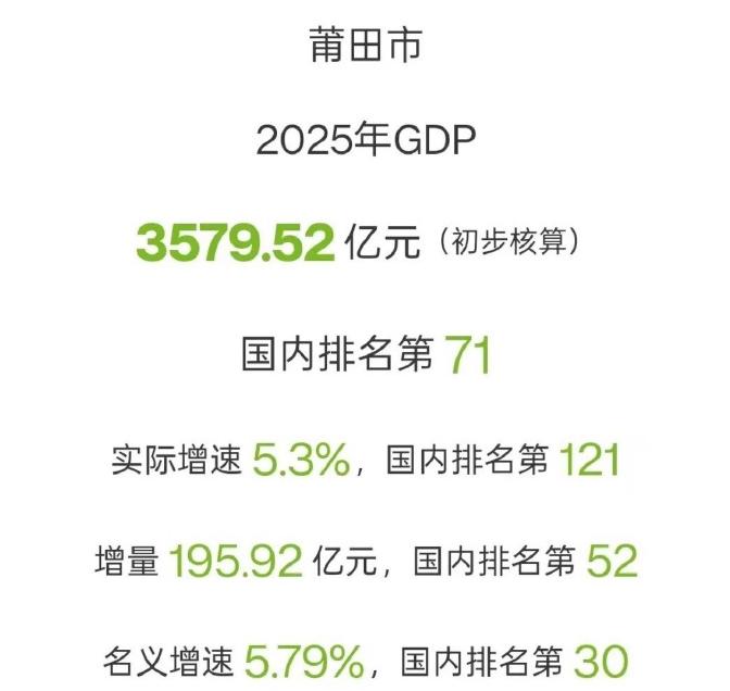 2025年莆田市GDP总量达3579.52亿元,全年实现195.92亿元增量,对应5.3%实际增速、5.79%名义增速。