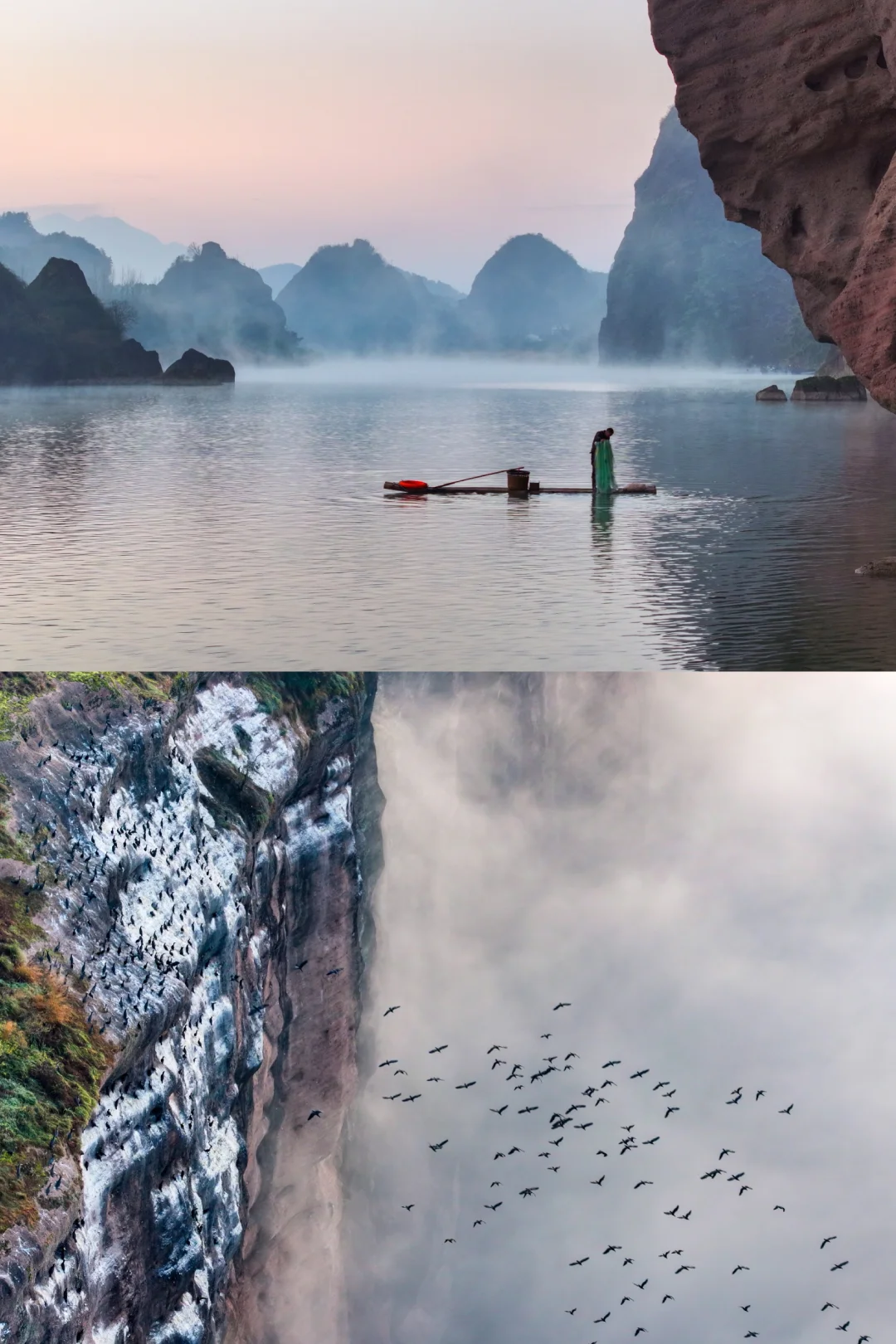 坐早班竹筏漂在河面上,薄雾绕着丹霞缓缓流