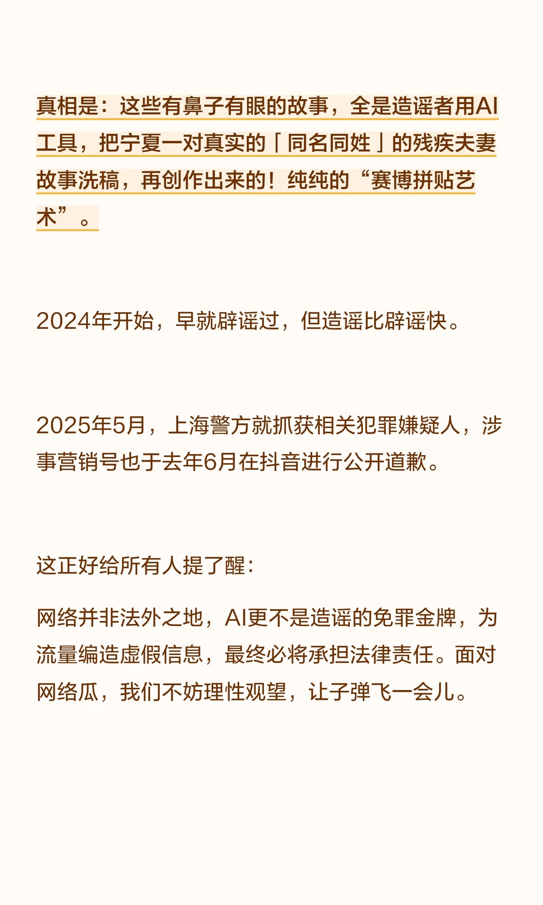 真相是:这些有鼻子有眼的故事,全是造谣者用AI工具,把宁夏一对真实的「同名同姓」的残疾夫妻故事洗稿,再创作出来的!纯纯的“赛博拼贴艺术”。