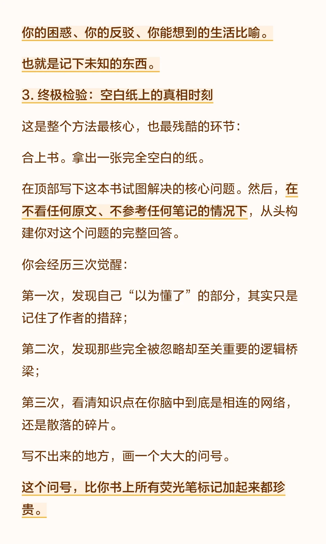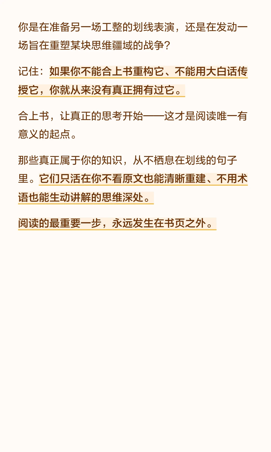 更隐蔽的是,划线创造了一种“可检索”的安全感。“我划过了,所以我知道它在哪里”悄悄变成了“我掌握了”。但残酷的事实是:知识在书中的位置,不等于知识在你脑中的拥有。