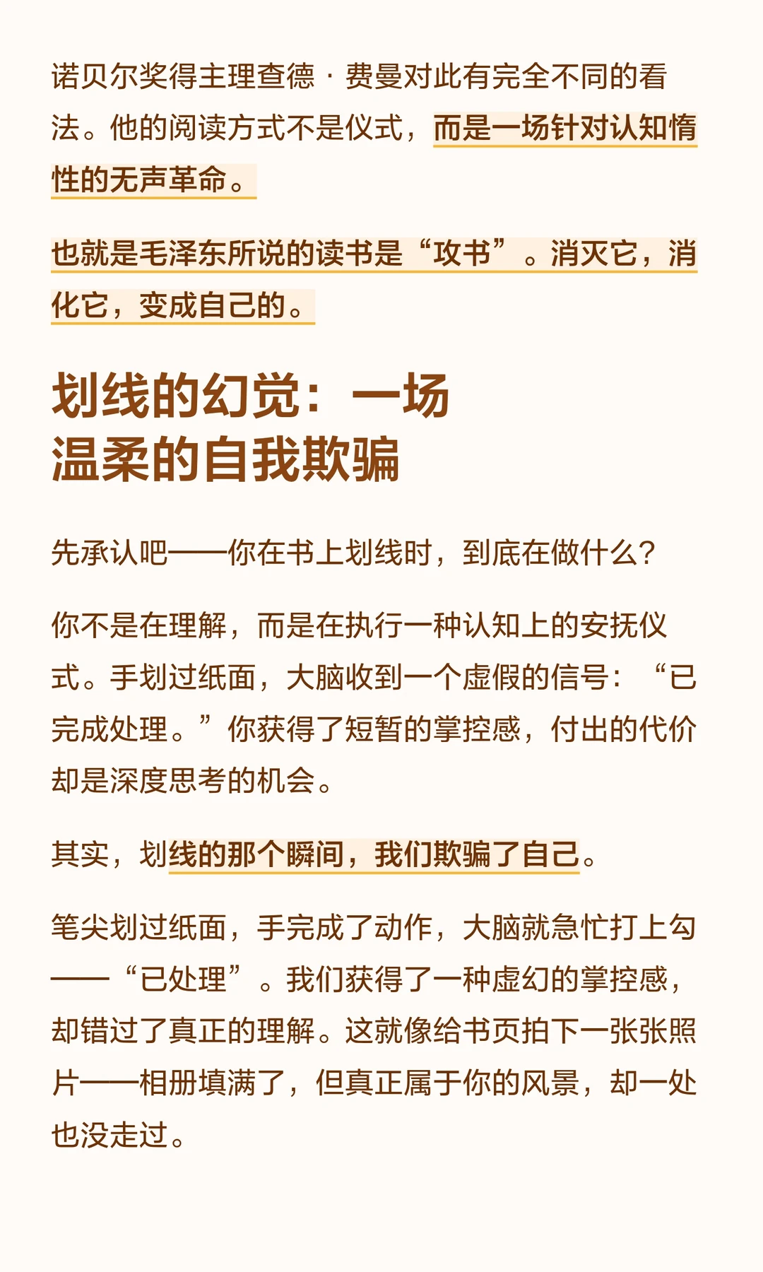 笔尖划过纸面,手完成了动作,大脑就急忙打上勾——“已处理”。我们获得了一种虚幻的掌控感,却错过了真正的理解。这就像给书页拍下一张张照片——相册填满了,但真正属于你的风景,却一处也没走过。