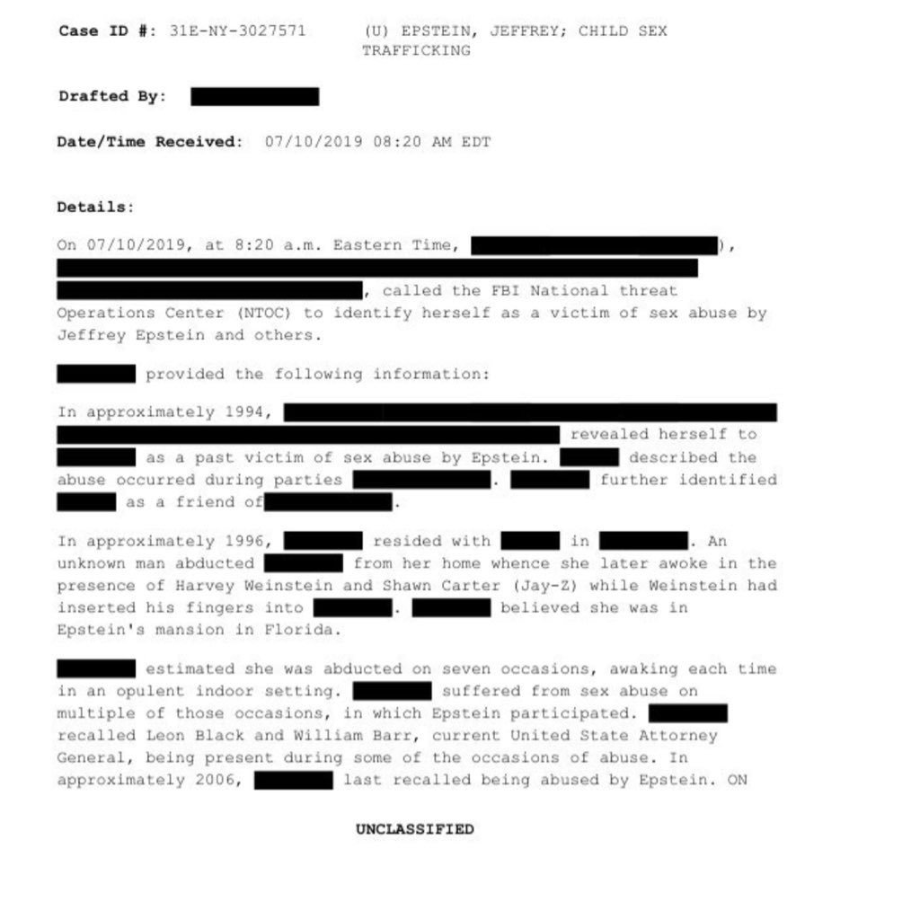 碧昂丝的丈夫Jay-Z被列在埃普斯坦的档案中。文件中的受害者称,她是在家中被一个身份不明的男子绑架的。她醒来时发现自己身处埃普斯坦在佛罗里达的豪宅里。哈维·韦恩斯坦和Jay-Z就在她身边,她遭到了性侵犯。