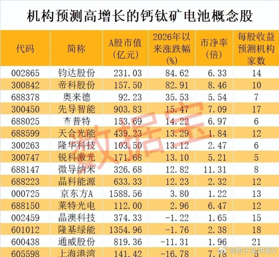钙钛矿电池技术迎重大突破!柔性量产难题攻克,产业化与太空应用落地提速暨南大学与上海交大联合团队取得钙钛矿电池核心技术突破,成功攻克柔性钙钛矿平米级制造行业难题:不仅实现24.52%的光电转换效率,柔性组件经10000次弯折后仍保持92.5%的初始效率,且大面积组件输出功率超220W。此次突破彻底解决了钙钛矿电池柔性与稳定性的核心痛点,为技术商业化量产、太空场景应用奠定坚实基础,钙钛矿光伏产业链迎来重要发展契机。钙钛矿产业链核心标的梳理分析1. 钧达股份:钙钛矿核心标的,布局TOPCon与钙钛矿叠层技术,2026年以来涨幅84.62%,市值231亿元,14家机构预测每股收益,市净率6.33倍;依托光伏电池产能加速技术落地,充分受益叠层电池产业化趋势,业绩增长预期明确。2. 帝科股份:钙钛矿银浆核心供应商,技术壁垒高,2026年以来涨幅82.91%,市值157.5亿元,10家机构覆盖,市净率8.46倍;银浆产品精准适配钙钛矿电池需求,受益技术突破带来的上游材料需求增长,业绩弹性充足。3. 奥来德:布局钙钛矿OLED材料与光伏设备,2026年以来涨幅35.53%,市值92.23亿元,7家机构覆盖,市净率5.54倍;依托材料技术积累切入产业链,受益行业技术迭代与产能扩张,成长属性突出。4. 先导智能:锂电设备龙头延伸钙钛矿设备业务,2026年以来涨幅15.47%,市值903.83亿元,17家机构覆盖,市净率7.09倍;为钙钛矿电池提供核心生产设备,深度绑定头部客户,受益产业化带来的设备需求增长,业绩稳健。5. 杰普特:激光设备核心企业,为钙钛矿提供激光加工设备,2026年以来涨幅14.22%,市值153.69亿元,6家机构覆盖,市净率6.97倍;技术壁垒高,设备适配量产需求,受益行业产能扩张,订单增长明确。6. 天合光能:光伏组件龙头布局钙钛矿叠层技术,2026年以来涨幅13.29%,市值439.23亿元,12家机构覆盖,市净率1.84倍;依托组件产能优势加速技术落地,受益叠层电池效率提升红利,业绩增长确定性强。7. 隆华科技:布局钙钛矿靶材与光伏材料,2026年以来涨幅13.12%,市值103.5亿元,6家机构覆盖,市净率2.47倍;依托靶材技术积累切入产业链,受益上游材料需求增长,技术协同效应显著。8. 锐科激光:激光设备龙头为钙钛矿提供加工设备,2026年以来涨幅13.10%,市值171.68亿元,5家机构覆盖,市净率5.21倍;技术实力突出,设备适配钙钛矿量产需求,受益行业产能扩张,订单增长明确。9. 微导纳米:钙钛矿镀膜设备核心供应商,2026年以来涨幅12.82%,市值326.68亿元,8家机构覆盖,市净率11.31倍;技术壁垒高,核心设备适配量产需求,受益钙钛矿产业化加速,业绩弹性充足。10. 晶科能源:光伏组件龙头布局钙钛矿技术,2026年以来涨幅12.23%,市值633.33亿元,12家机构覆盖,市净率2.32倍;依托全球产能优势加速技术落地,受益叠层电池效率提升,业绩增长确定性强。11. 京东方A:显示龙头延伸钙钛矿光伏业务,2026年以来涨幅3.80%,市值1588.56亿元,13家机构覆盖,市净率1.22倍;依托显示技术积累切入钙钛矿产业链,受益行业技术迭代与产能扩张,具备长期成长属性。12. 莱特光电:OLED材料龙头延伸钙钛矿材料业务,2026年以来涨幅2.96%,市值112亿元,12家机构覆盖,市净率6.47倍;技术实力突出,材料产品适配钙钛矿需求,受益上游材料需求增长,业绩弹性充足。13. 晶澳科技:光伏组件龙头布局钙钛矿技术,2026年以来微跌1.22%,市值374.33亿元,15家机构覆盖,市净率1.65倍;依托组件产能优势加速技术落地,受益叠层电池效率提升,业绩增长确定性强。14. 隆基绿能:光伏组件龙头布局钙钛矿叠层技术,2026年以来微跌1.76%,市值1354.96亿元,18家机构覆盖,市净率2.38倍;依托核心技术与产能优势加速技术落地,受益叠层电池产业化进程,业绩稳健有支撑。15. 通威股份:硅料与电池片龙头布局钙钛矿技术,2026年以来下跌11.31%,市值819.36亿元,21家机构覆盖,市净率1.96倍;依托光伏全产业链优势加速技术落地,受益叠层电池效率提升,具备长期成长属性。16. 上海港湾:布局钙钛矿光伏支架业务,2026年以来下跌16.78%,市值141.42亿元,5家机构覆盖,市净率7.78倍;依托工程技术积累切入产业链,受益钙钛矿光伏电站建设需求,业务协同效应显著。板块总结与投资展望本次钙钛矿电池柔性与大面积制造难题的攻克,是行业产业化进程的重要里程碑,不仅为商业化量产扫清核心障碍,更打开太空应用等全新场景,叠加政策扶持与资本加持,钙钛矿光伏行业长期增长逻辑明确。目前A股概念股覆盖上游材料、核心设备、下游组件等全产业链环节,部分标的短期涨幅显著反映市场情绪热度,但投资需聚焦核心逻辑:优先选择具备核心技术壁垒、深度绑定产业链头部企业、技术落地与产能兑现节奏明确的标的,把握产业发展红利;同时需警惕板块短期估值波动风险,区分技术成熟度与实际产能落地进度,结合基本面择优布局。