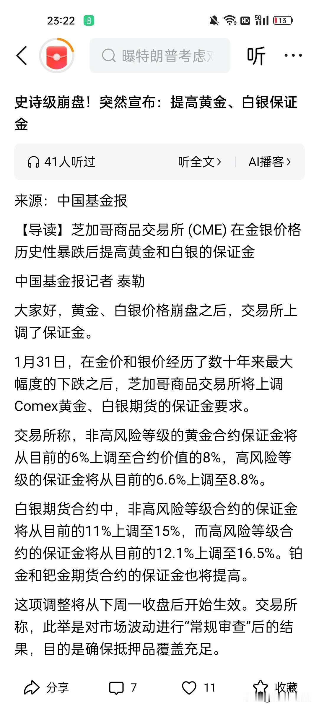 芝加哥商品交易所(CME)提高黄金和白银的保证金,这是打算把黄金,白银多头往死里整啊。白银周五暴跌35%,很多做多白银的投资者估计止损都来不及,现在CME突然大幅提高保证金,估计白银还会进一步下跌。下周一估计白银,黄金还是腥风血雨,国内白银期货已经跌停了。当大部分投资者一致看多白银,甚至喊白银会涨到200美金,结果风险提前来到,而且是史无前例的暴跌。这种暴跌,肯定是白银主力看到了太多散户做多白银,市场永远是残酷无情的,大家觉得呢?