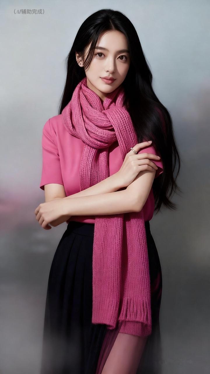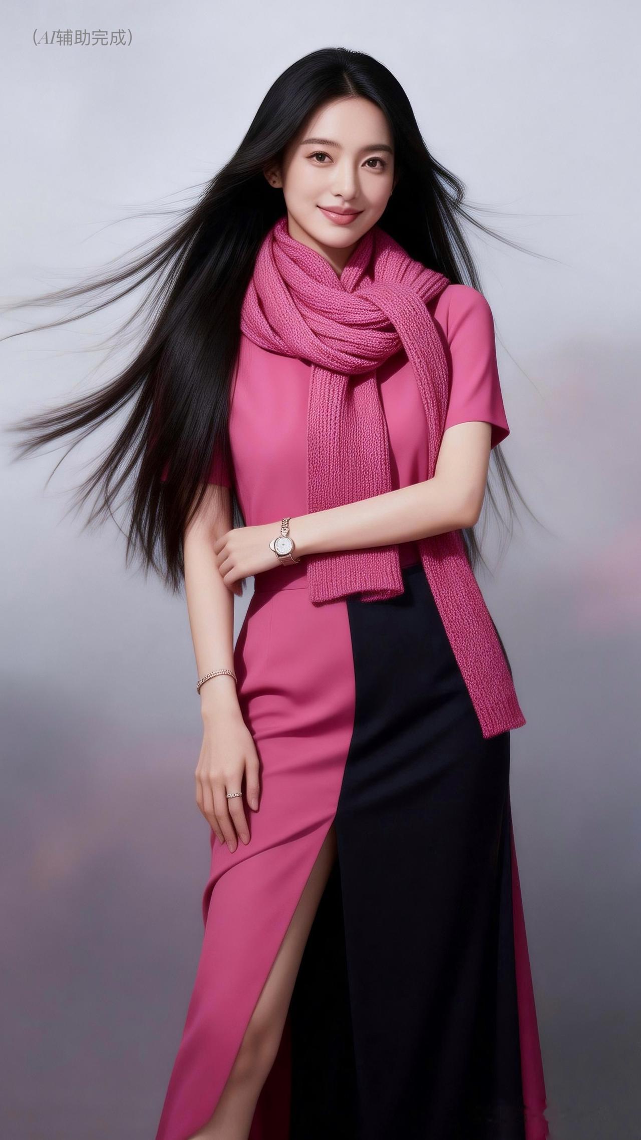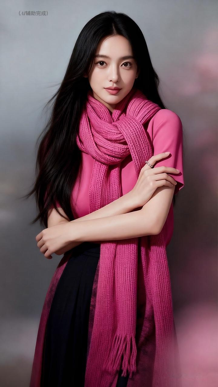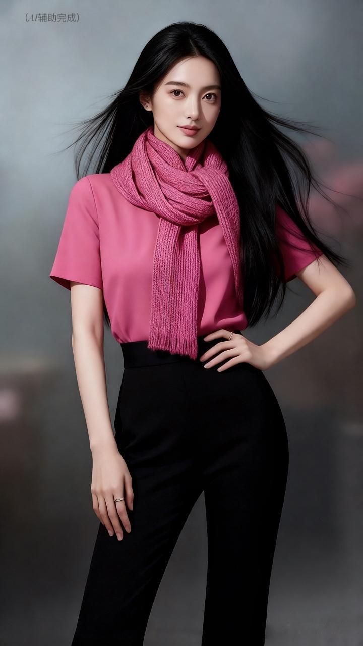 乌发如瀑飘逸,玫粉上衣搭同色流苏围巾(质感厚实)流光溢彩,黑裙开叉显腿线。眸亮含情叉腰抬臂雅,围巾流苏轻扬添柔韵。浅灰朦胧衬温婉大气时尚自信,这帧美人一眼沦陷!