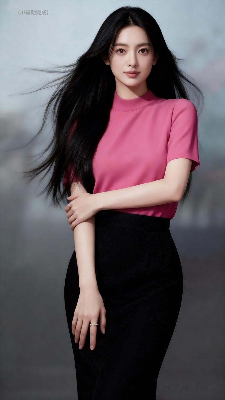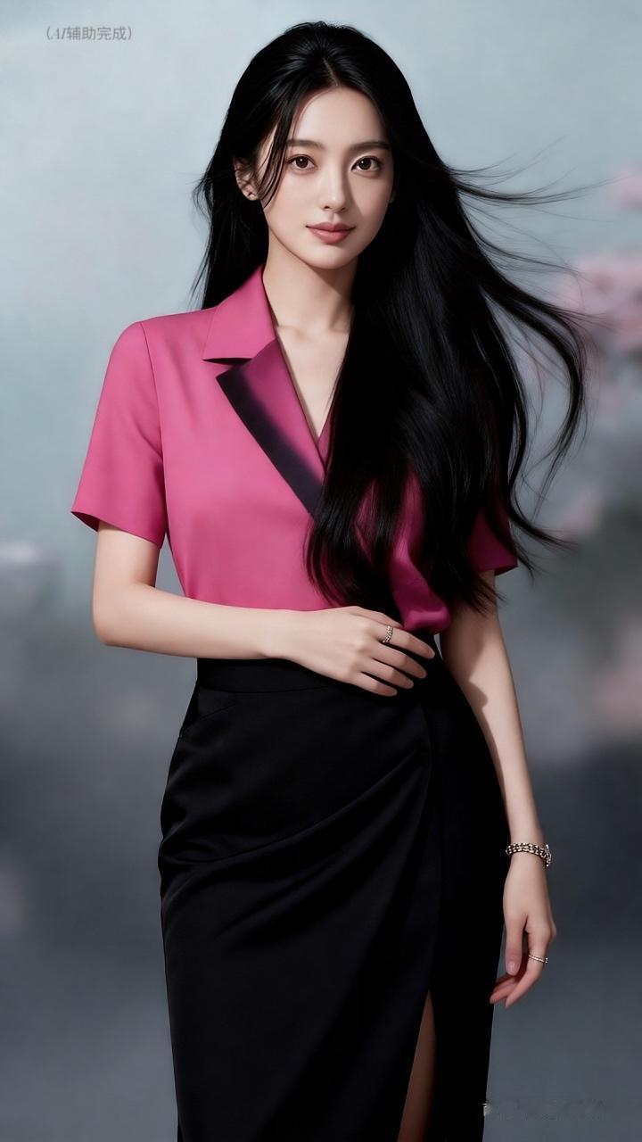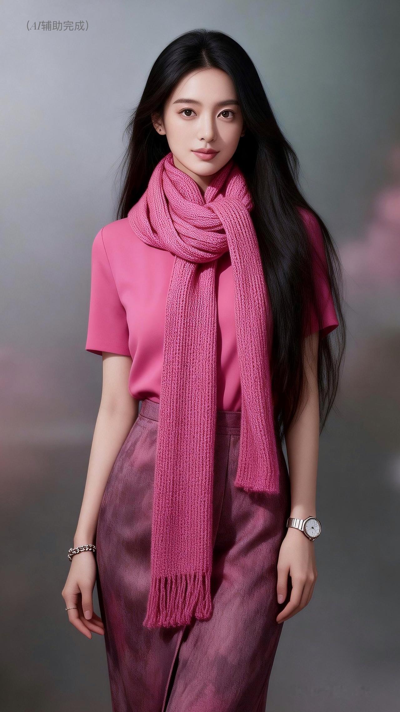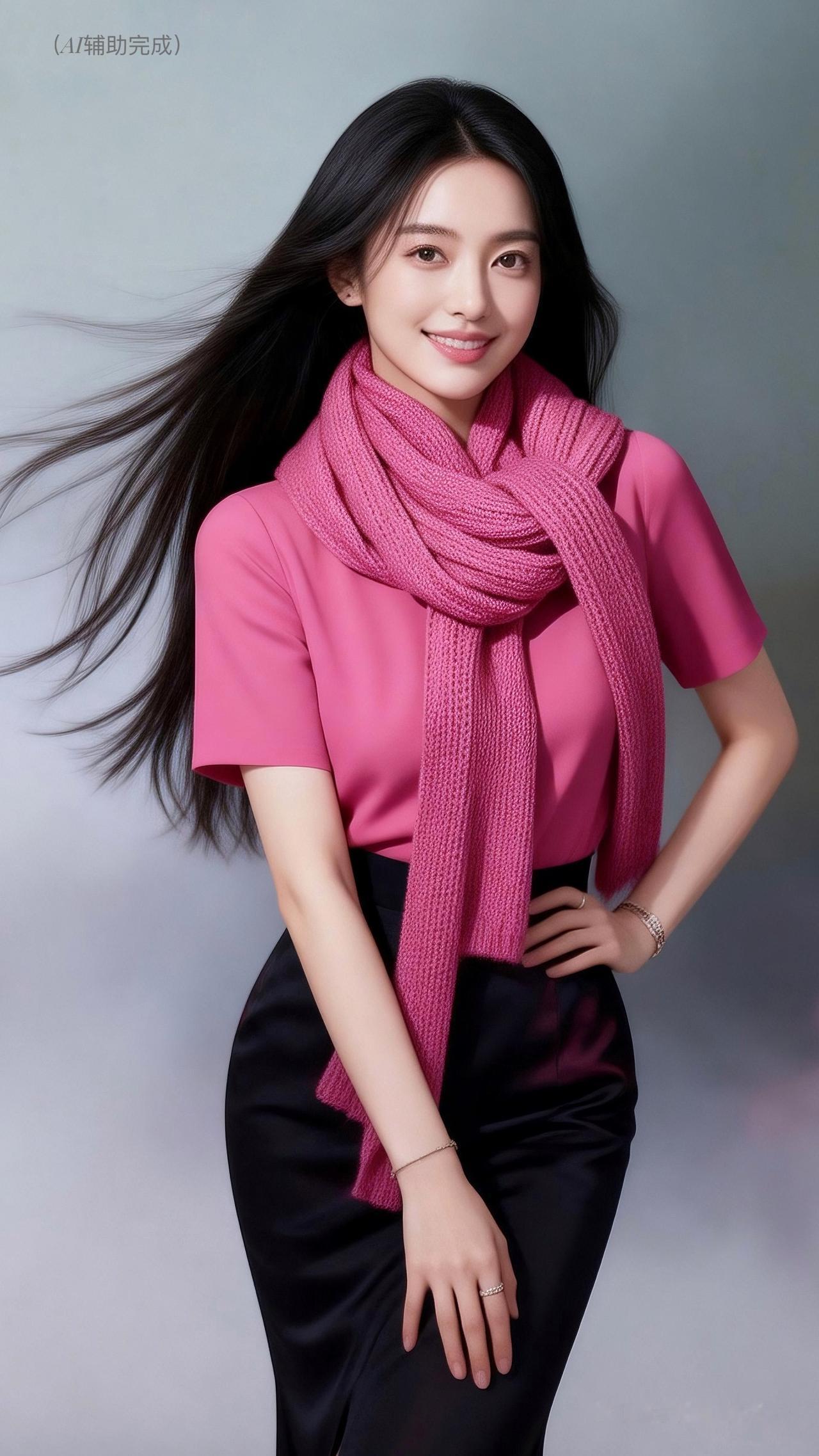 乌发如瀑飘逸,玫粉上衣搭同色流苏围巾(质感厚实)流光溢彩,黑裙开叉显腿线。眸亮含情叉腰抬臂雅,围巾流苏轻扬添柔韵。浅灰朦胧衬温婉大气时尚自信,这帧美人一眼沦陷!
