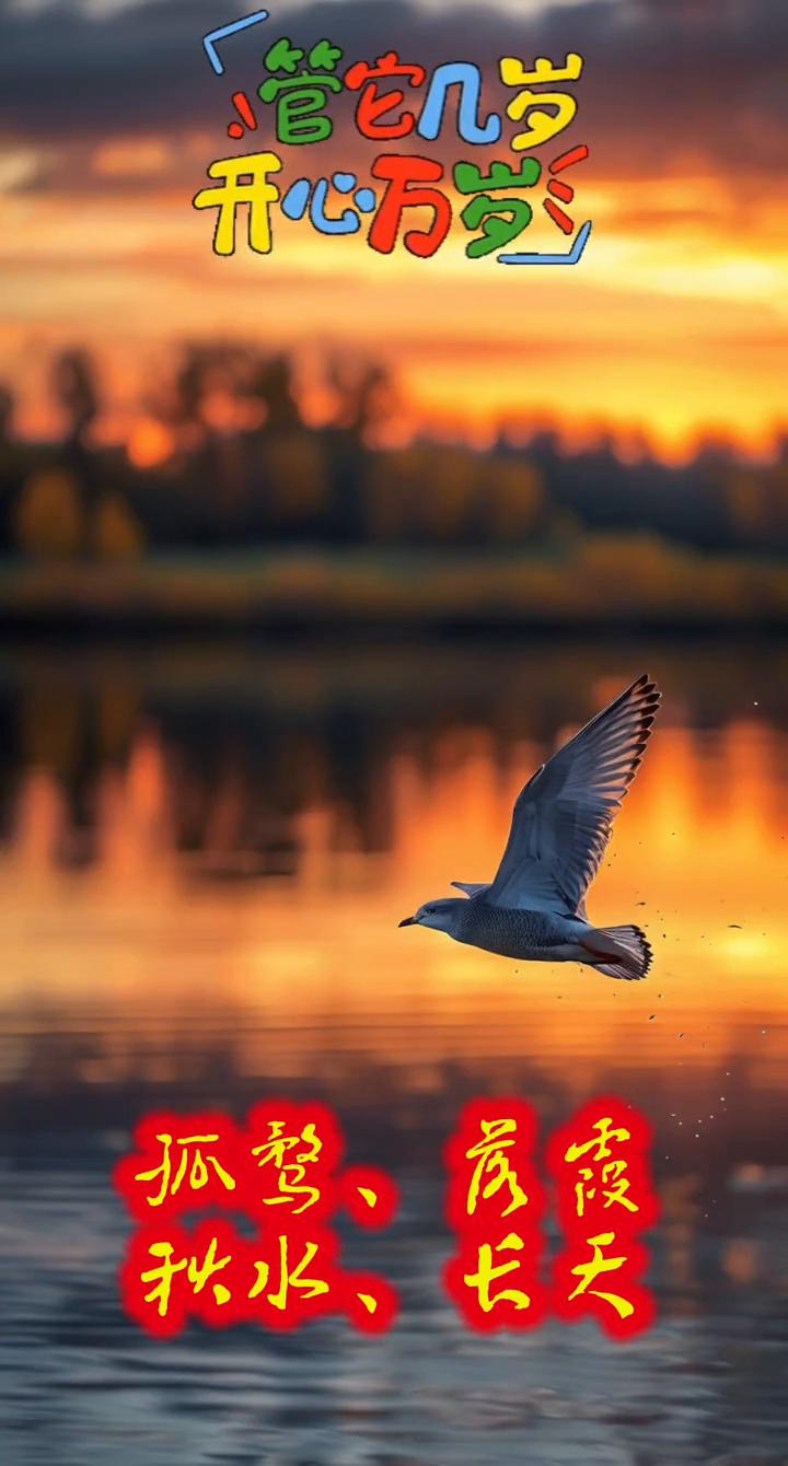 孙鹭与落霞齐飞,秋水共长天一色。 管它几岁,开心万岁。 孤鹜齐飞,秋水共长天一色。 管它几岁,开心万岁。 早安吉祥!