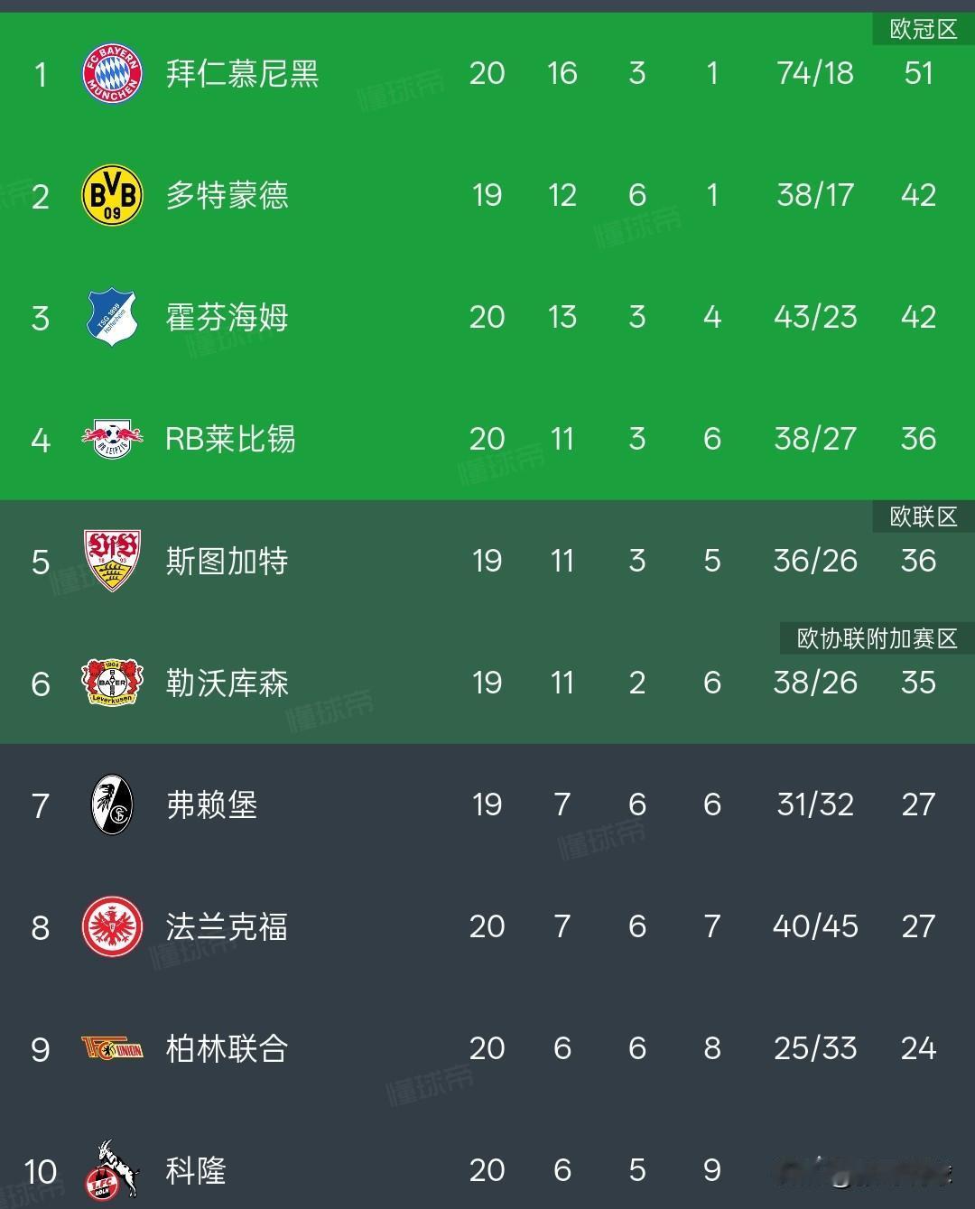 德甲积分榜丨汉堡2-2拜仁慕尼黑,汉堡连续三场平局,汉堡队4胜7平8负积19分排名积分榜第13位,汉堡队只领先保级附加赛一个积分,对拜仁这场平局非常重要。 拜仁慕尼黑16胜3平1负积51分排名第一,多特蒙德和霍芬海姆同积42分位列第二和第三位,莱比锡红牛,斯图加特,勒沃库森也在欧战区,欧战球队的位置很稳固。