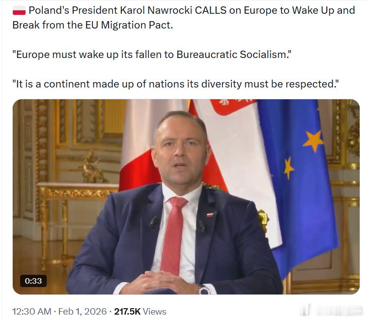 波兰总统卡罗尔·纳夫罗茨基呼吁欧洲醒觉,脱离欧盟移民公约。