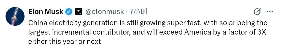 埃隆.马斯克发文说中国的发电量仍在高速增长,其中太阳能发电是最大的新增贡献者,预计今年或明年将超过美国三倍。