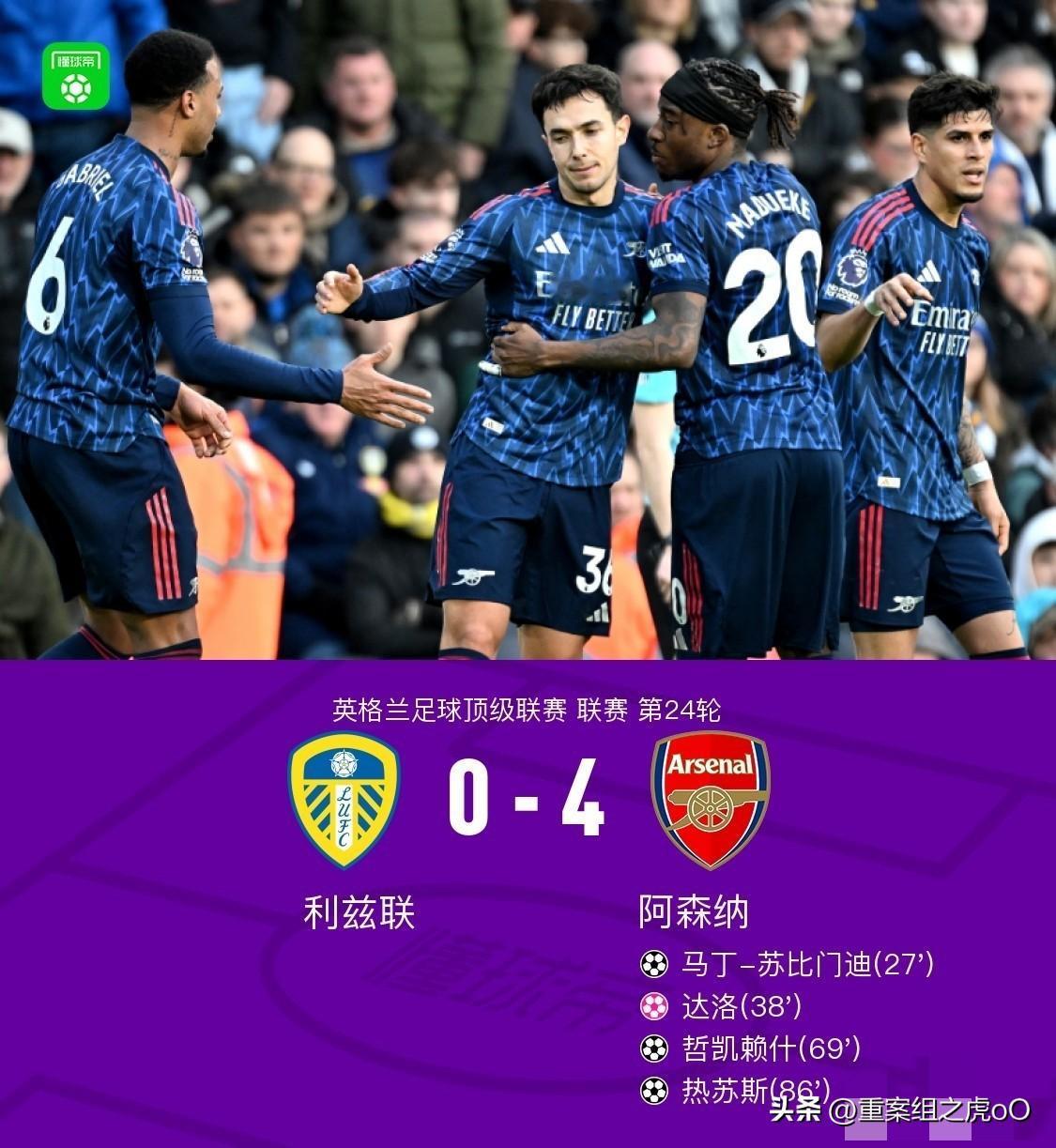 阿森纳4-0利兹联, 今天零封,大胜,小队长有助攻,有轮换,换人早,场面好。恭喜塔子获得三天呼吸权 这场能大胜当然和对手实力有直接关系,最近的比赛下来还是可以看出,目前的我厂在进攻端如果要踢地面渗透,并不具备手术刀般的传球手和足够默契的传跑配合,效果上还是坚决直接的增加传中数量更明显,当然这样也会丢失很多球权,而在防守端当赖斯不在位置时苏比一人在后腰位置的拦截能力还是不稳。所以在进攻效率和控球上寻找动态平衡依然是本赛季最难的问题,解决好了应该没有球队能阻止我们夺冠的步伐了。加油吧!