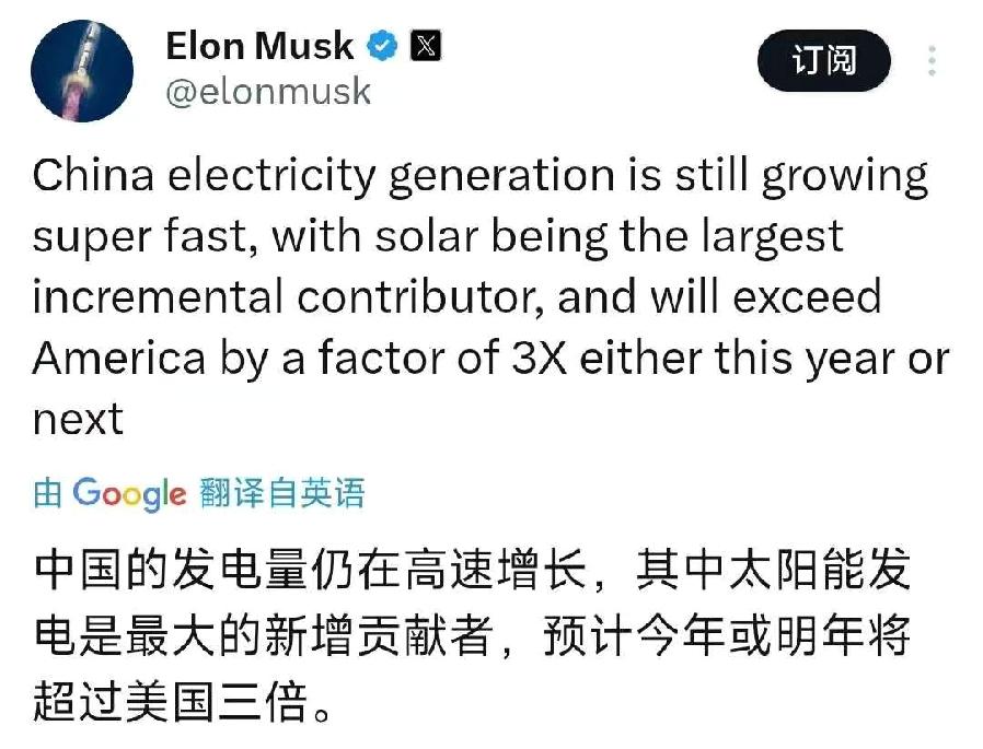 2月1日,马斯克发文:“中国的发电量仍在高速增长,其中太阳能发电是最大的新增贡献者,预计今年或明年将超过美国三倍。” [机智]马斯克的判断,正是中国能源转型硬核实力的国际印证。2025年中国太阳能发电装机达12亿千瓦、发电量同比激增42.6%,新增量超欧盟总量,而美国光伏占比仅7%,差距背后是中国十年磨一剑的产业积淀。从“西电东送”架起能源大动脉,到新能源专利占全球四成,中国以“风吹日晒”撑起全球1/3发电量,更以光伏风电产品助全球减碳41亿吨。在全球能源博弈从化石转向绿电的当下,中国的绿色增长不仅是自身发展答卷,更成为全球低碳转型的核心引擎,让能源竞争的赛道更具时代温度!