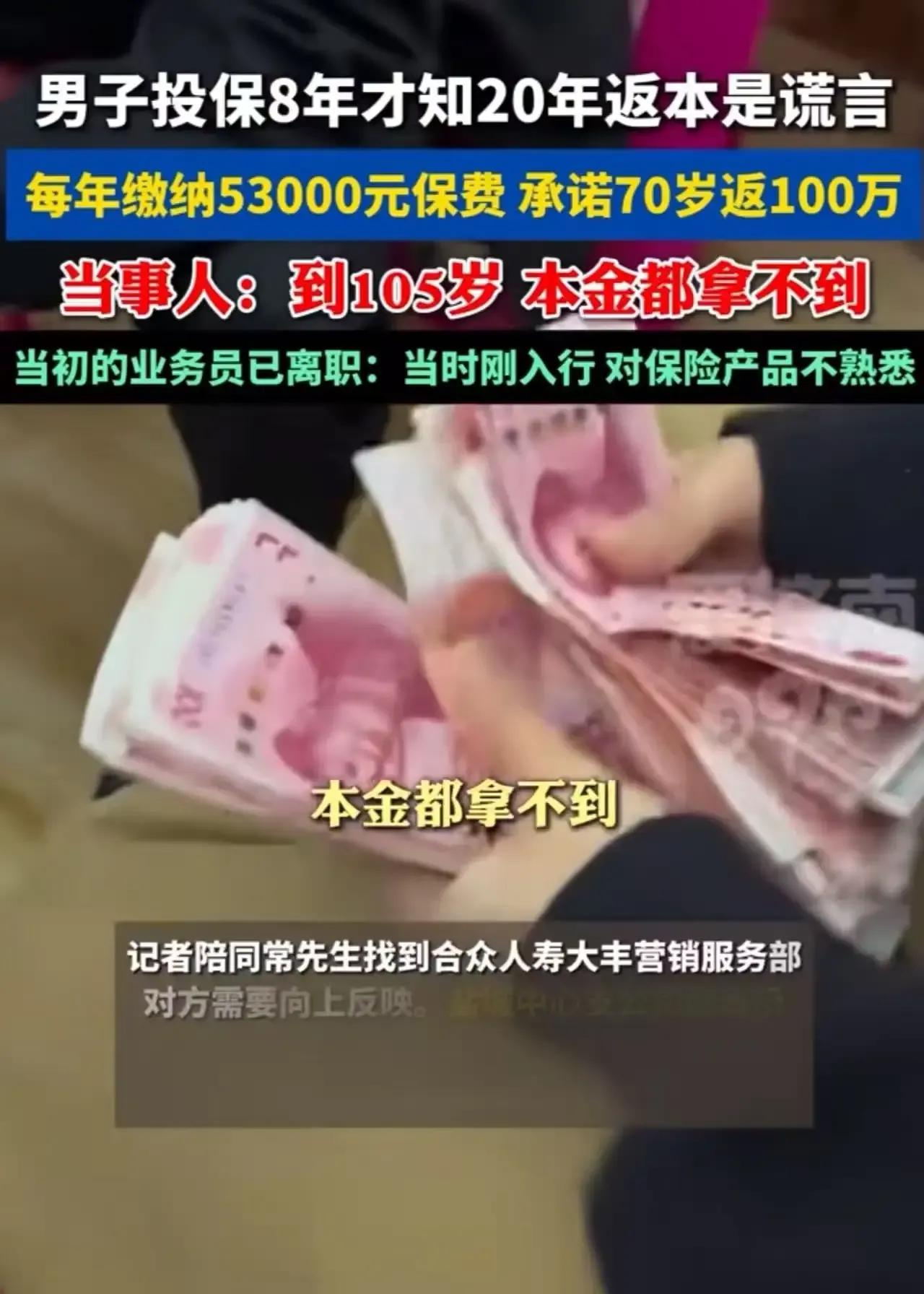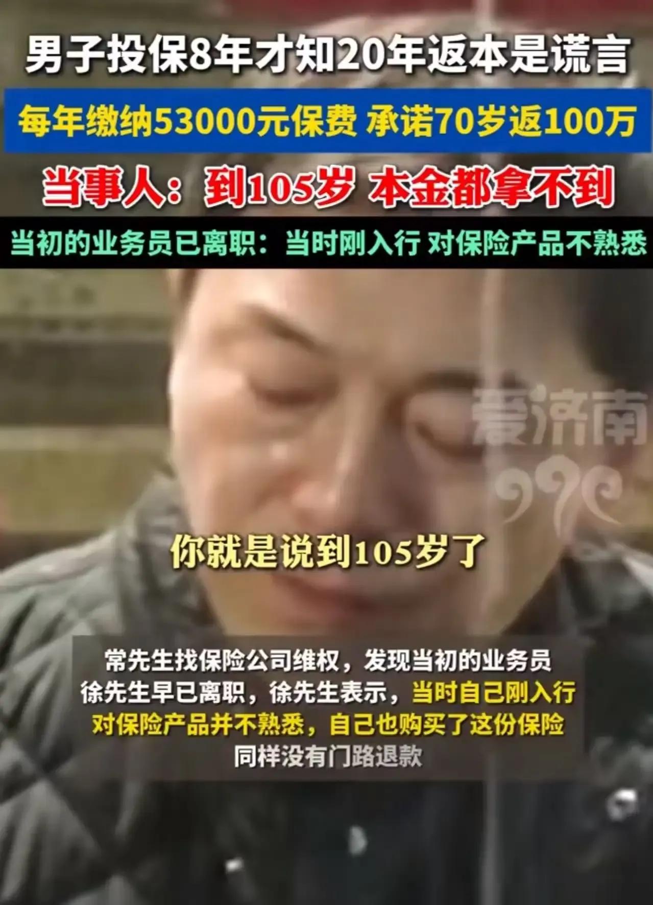 每年交53000元保费,坚持了8年,却被告知20年返本是谎言?这究竟是怎么回事?一位男子就遭遇了这样的糟心事,他直言:“就算我活到105岁,连本金都拿不到!” 据了解,这位男子当初购买保险时,业务员承诺20年后可以返本。男子信以为真,每年都按时缴纳保费,一交就是8年。然而,当他想要了解返本情况时,却得到了一个晴天霹雳的消息:20年返本根本就是谎言!男子愤怒不已,找到当初的业务员理论,可对方却表示已经离职,当时刚入行对保险产品不熟悉。这样的回应让男子更加气愤,他觉得自己的权益受到了严重侵害。此事曝光后,网友们也纷纷表示愤慨,认为本来买保险是为了图个保障,结果却跟诈骗一样。保险作为一种风险转移工具,本应给人们带来安心,但如今却因为一些不负责任的业务员和误导性的宣传,让人们对保险产生了信任危机。 保险不是儿戏,选择时务必擦亮眼睛,别让辛苦钱打了水漂。对于这位男子的遭遇,你有什么看法呢?快来评论区留言讨论,一起揭露保险行业的那些“坑”!保险保本么 寿险退保 保险谎言