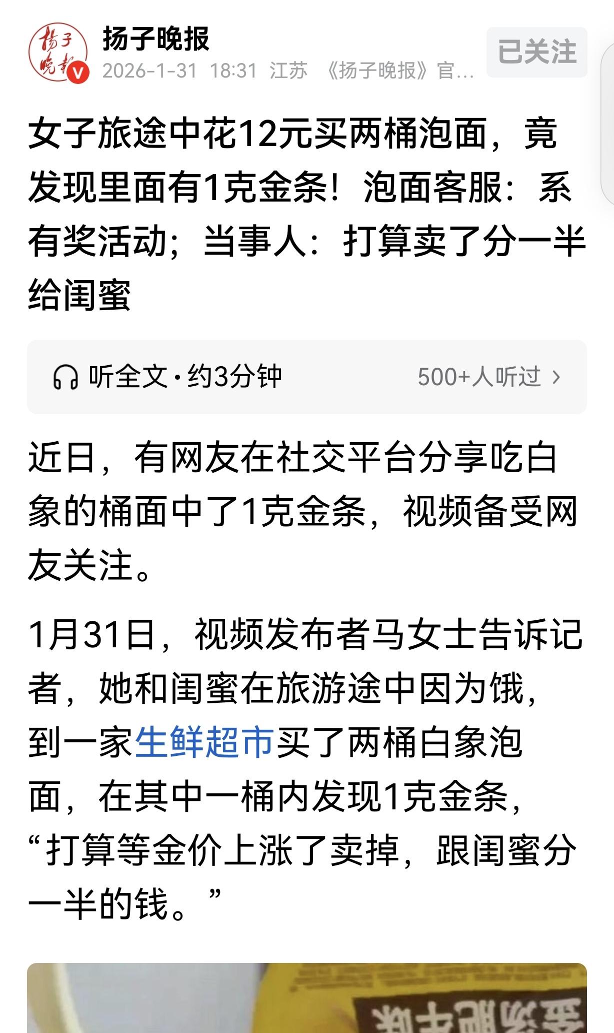 “意外之财!”河南开封,女子跟闺蜜旅游,肚子饿了,就买了2捅泡面,万万没想到,竟然发现其中一桶有1克金条。女子又惊又喜,赶紧给客服打电话,客服回应:恭喜你,是有奖活动。女子狂喜,打算金价再涨涨,卖了分一半给闺蜜。网友:如果是真的,那就是不正当竞争,忽悠消费者。 1月25日,河南洛阳的马女士闲来无事,在家待的难受,就跟闺蜜约着去开封逛一圈。 旅游没出省,所以,马女士跟闺蜜也没买吃的,嫌大包小包带着麻烦,反正如果饿了,餐馆便利店到处都是,也饿不着。 她们到了开封已经下午4点了,此时的两人饥肠辘辘,如果下馆子,说是午饭太晚了,当做晚饭又太早了,两人一合计,就去生鲜超市买了2桶方便面准备垫补一下。 2桶方便面12块钱,可马女士万万没想到,打开方便面竟然发现了惊喜。 原来,马女士在其中一桶方便面里,发现了1克金条,金条上还印着这个牌子方便面的名字。 马女士又惊又喜,虽然财帛动人心,但君子爱财取之有道,她必须得搞清楚这是咋回事? 马女士给方便面客服打去电话,对方告诉她,这个牌子的方便面在搞活动,恭喜她中奖了。 马女士被这天降意外之财砸懵圈了,好半天才反应过来,她开心坏了,发视频分享自己的喜悦。 见者有份,马女士决定到时候把金条卖了,跟闺蜜一分为二,但这几天金价下跌,她决定等金价涨涨再卖。 有人表示质疑,有金条的早就被金属扫描仪扫完了,根本不可能到消费者手上;有人调侃,那算啥?我上次买桶泡面发现里面一个金戒指;有人眼红,吃了这么多年泡面也没中金条,为啥别人泡面中金条 辣条中金条? 有人不信,子虚乌有,有没有放金只有商家知道,一克黄金能打成金条吗?反对商家不正当竞争,以后其他品牌品牌有样学样。促销软文、轮不到你的…大概率是老板亲戚晒图、写手撰文。 嚯!现在连吃个泡面都能开出‘隐藏款了”,这波营销玩得真溜,直接往面里塞‘硬通货’,这可比中‘再来一桶’刺激多了!不过网友们都开始拿探测仪扫货了,厂家可得提醒大家,惊喜虽好,健康更重要,面还是要好好吃的呀! 不得不说,这波营销确实玩明白了,但看热闹归看热闹,这事里藏着不少值得琢磨的地方。 首先是商家的小心思。用金条当奖品,比打折、送小零食高端太多,自带话题度。 网友们不管信不信,都会主动帮着传播,免费流量直接拉满。而且1克金条成本也就四百多块,全国投放2026份,总花费才八十多万,换回来的曝光量可比硬投广告划算多了。 但也正因为奖品太诱人,才让不少人动歪心思,拿金属探测仪扫货,完全背离了活动“随机惊喜”的初衷。 再看消费者的反应。有人眼红,有人质疑,更多人是凑热闹玩梗。其实换个角度想,马女士的清醒才是最难得的。 她买泡面就是因为饿了,中奖纯属意外,还想着跟闺蜜分钱,没被从天而降的金子冲昏头。 反倒是那些为了中奖疯狂囤货、用工具筛选的人,把原本的消费变成了赌博,最后大概率是竹篮打水一场空。 至于说不正当竞争,确实有点杞人忧天。只要商家活动规则透明,没有暗箱操作,就不算违规。 怕就怕有人模仿时玩猫腻,比如偷偷把奖品留给内部人,那才是坏了规矩。 总的来说,这事就是一场双赢的营销,商家赚了流量,中奖者得了实惠,普通人看个乐子,挺好。 《不正当竞争法》第10条规定,经营者进行有奖销售不得存在下列情形:(一)所设奖的种类、兑奖条件、奖金金额或者奖品等有奖销售信息不明确,影响兑奖;(二)采用谎称有奖或者故意让内定人员中奖的欺骗方式进行有奖销售。 本案中,品牌公开告知金条投放数量与活动规则,且中奖用户为普通消费者,没涉及暗箱操作,不属于不正当竞争。 但如果后续商家没如实兑现奖品,消费者可据此维权。 对此,你怎么看?