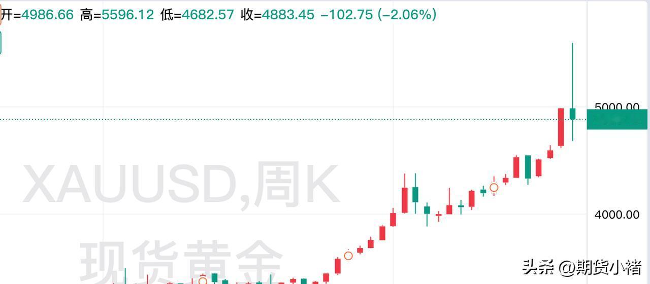 现货黄金冲高回落, 小幅下跌,为近期第一次下跌。 当周金价开盘4986.66美元, 盘中最高升至5596.12美元, 盘中最低跌至4682.57美金, 收盘于4883.45美元, 较上一日下跌102.75美金, 跌幅为2.06%。 对于未来几天, 期货小褚认为 关注上方5100压力情况!