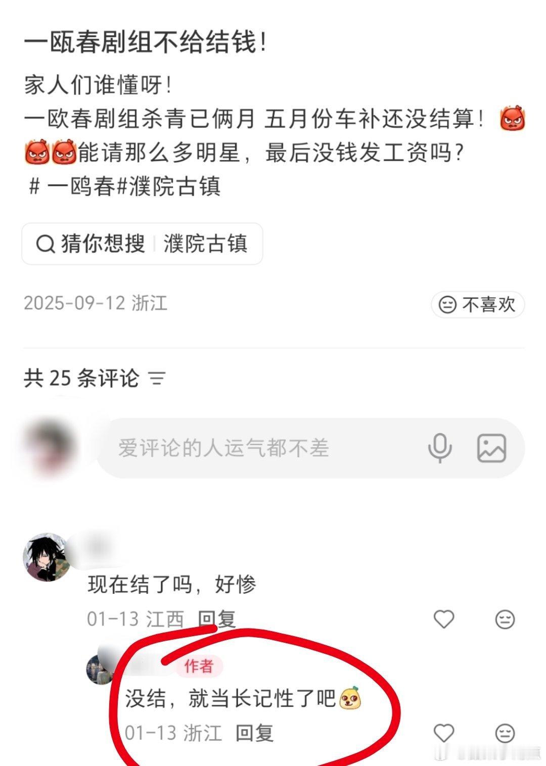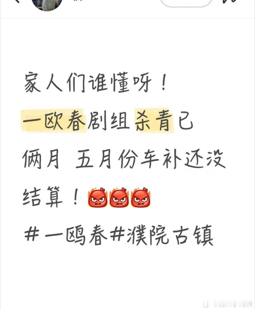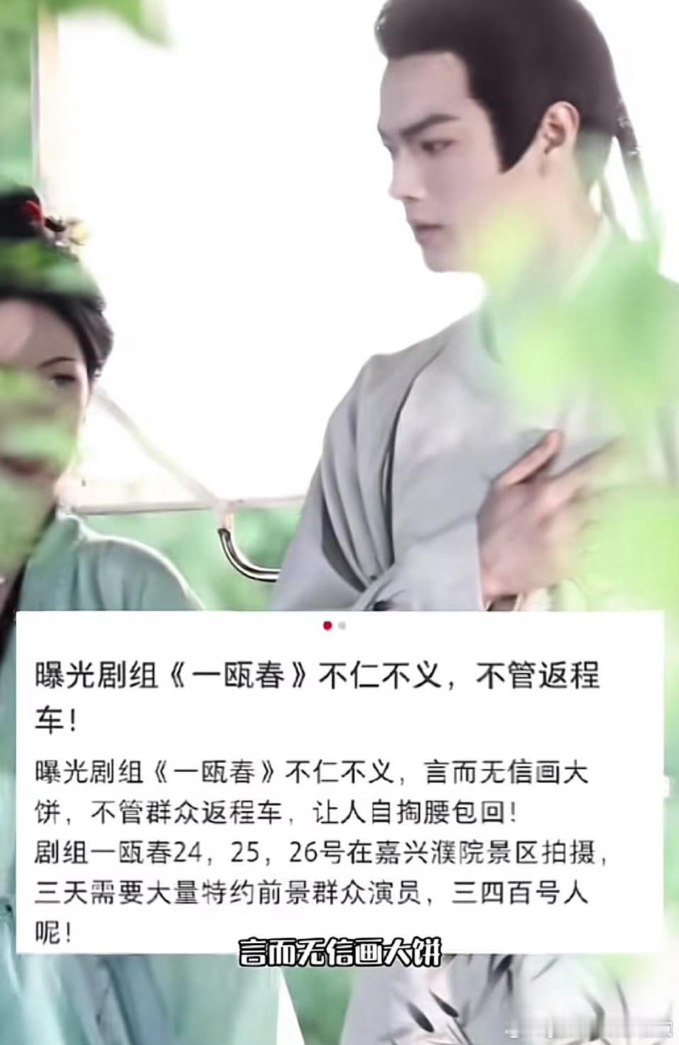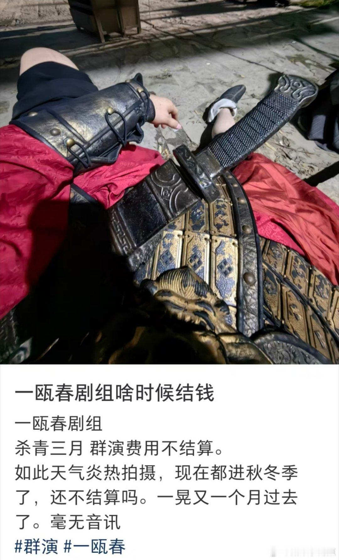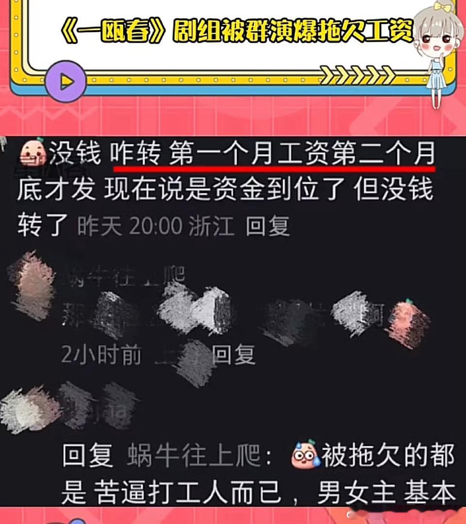 许凯 周也 徐振轩主演的《一瓯春》剧组曝出拖欠群演工资,到现在还没有删帖,许凯粉丝称 25 年 7 月杀青,26 年 1 月群演还回复网友称:没结这么大的剧组拖欠工资半年之久,素人维/权不易,不知道剧组有没有给主演结工资呢?