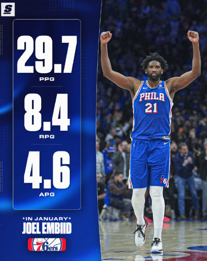 76人今天在主场以124-114力克鹈鹕,迎来一波三连胜,战绩来到27胜21负,继续位居东部第六。鹈鹕战绩变成13胜38负,继续排在西部倒数第二。 恩比德依旧状态火热,统治力十足,出场39分钟,27投13中,三分5中3,罚球14中11,砍下全场最高的40分11篮板外加4助攻1抢断2盖帽,也有5失误,正负值+16。值得一提的是,40分也创恩比德个人赛季新高,此前的最高纪录是2025年12月13日对阵步行者的39分。这也是恩比德生涯第49次40+,追平了奥尼尔。 恩比德上一次在常规赛单场砍下40+,还要追溯到两年前,2024年1月23日对阵马刺的比赛,当时恩比德狂砍70分18篮板5助攻。但是接下来,恩比德频繁受到伤病困扰,就再也没能拿过40+,直到今天。 恩比德过去一段时间也找回了巅峰时期的状态,过去7场比赛有6场砍下30+,场均可以得到34分。整个1月,恩比德出战14场比赛,场均登场34.2分钟,可以砍下29.7分8.4篮板4.6助攻,投篮命中率54%。 在今天的比赛之前,乔治因为使用违禁药品被联盟宣布禁赛25场,接下来一段时间都将无法出战。乌布雷表现不错,出场30分钟,13投7中,三分7中3,罚球4中2,拿到19分10篮板4助攻,正负值+11。 上一场狂轰40+的马克西发挥一般,出战35分钟,18投7中,三分9中4,砍下18分5篮板8助攻1抢断,正负值+5。探花埃奇库姆表现还可以,首发出战37分钟,投篮10中6,三分球5中2,罚球1中1,拿到15分3篮板5助攻1抢断的数据,正负值+7。 鹈鹕这边,萨迪克·贝依旧发挥出色,首发出战了32分钟,19投12中,三分7中4,罚球6中6,砍下全队最高的34分,还有6篮板3助攻进账。这也是萨迪克-贝过去5场第二次砍下30+。墨菲中规中矩,出战38分钟,投篮21中8,三分11中3,得到19分9篮板2助攻1盖帽。锡安表现不佳,出场30分钟,6投仅2中,罚球9中7,只拿到11分5篮板2助攻2盖帽,正负值-17最低。