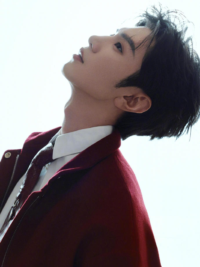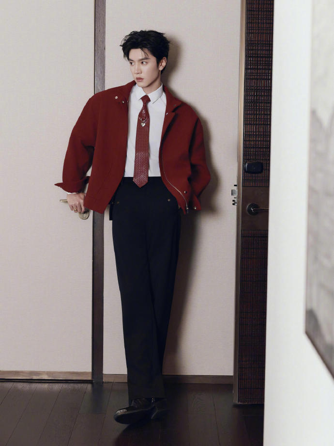 陈哲远出席线下活动造型,身着红色毛呢夹克,搭配衬衫和编织纹领带,佩戴金色戒指首饰,完全帅气又不失新春气息
