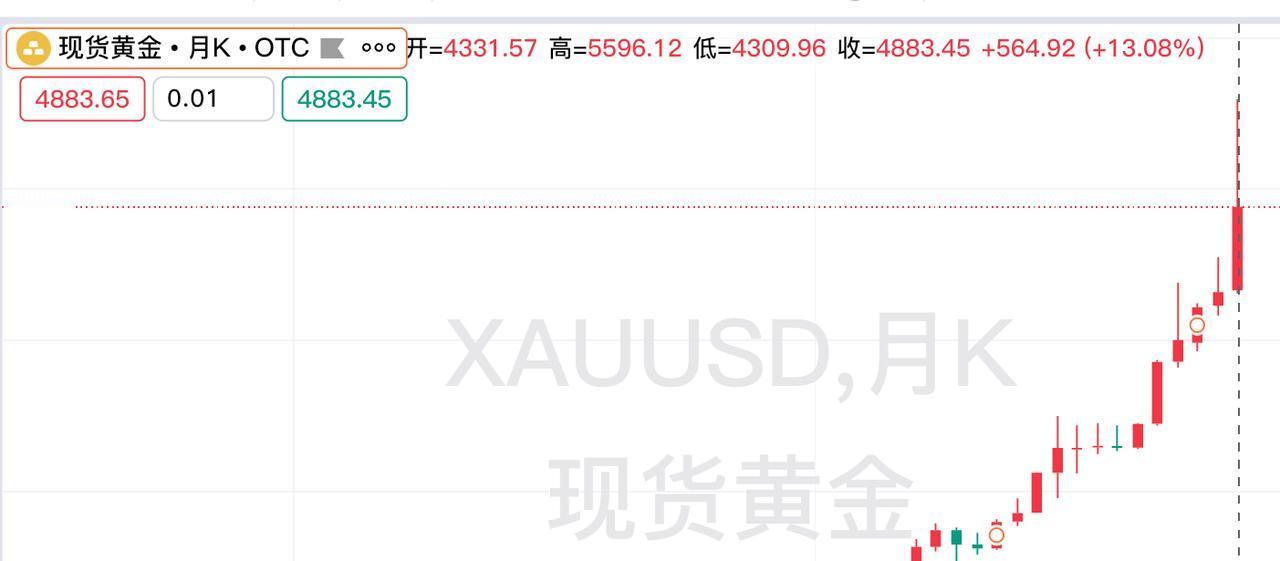 刚刚过去的一个月, 现货黄金价格继续走强上涨。 当月低开高走,震荡运行。 开盘价4331.57美元/盎司, 盘中最高升至5596美元, 最低价格为4309.96美元, 最终收盘于4883.45美金, 较上一个月上涨564.92美金, 涨幅为13.08%, 也是连续第六个月上涨。 对于现货黄金后市, 短期关注上方5100压力!