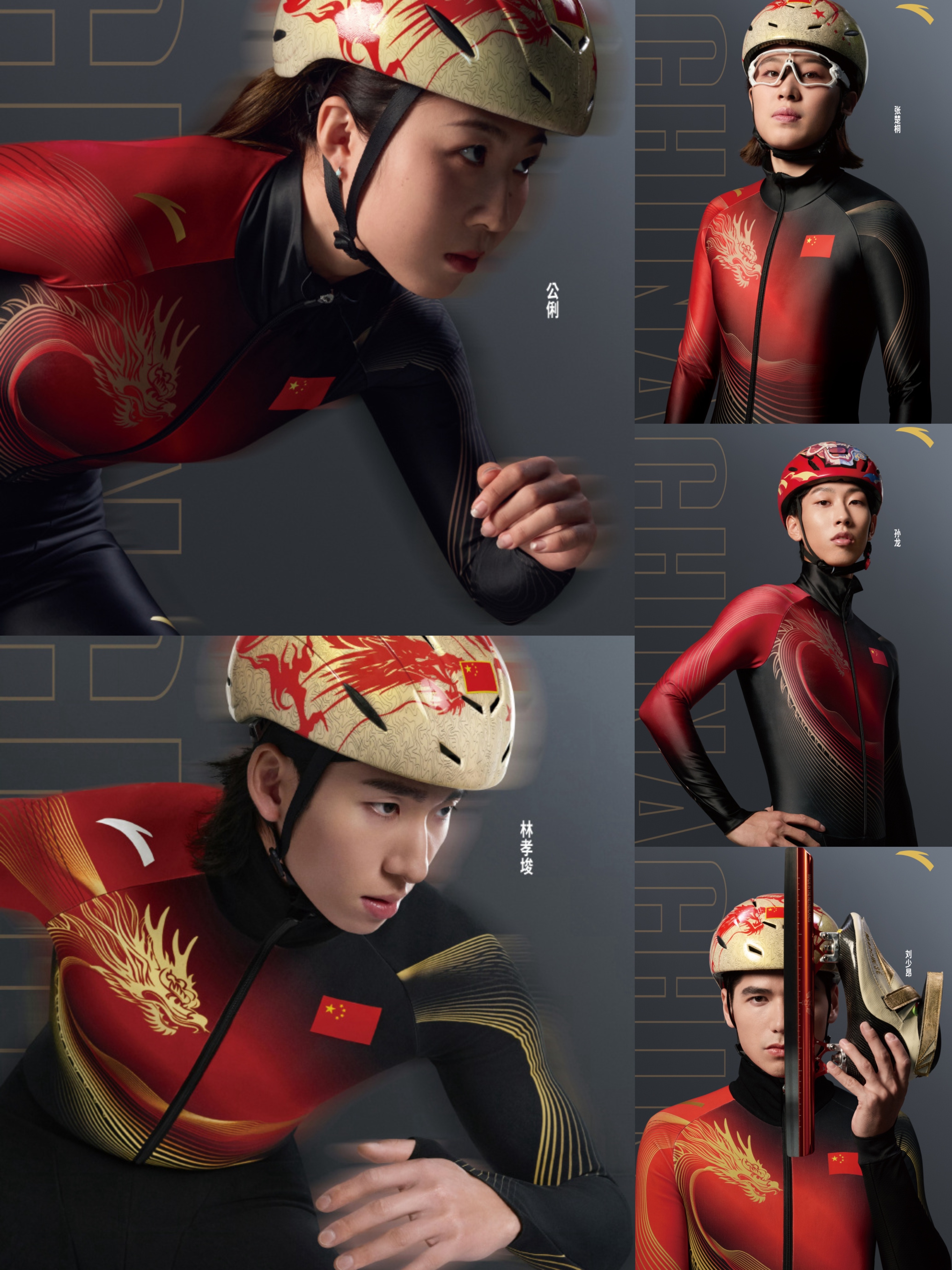 冬奥会时尚图鉴时尚灵感解读 以“龙”为核心视觉的短道速滑战袍,将中国红与金色龙纹完美融合,霸气又灵动。公俐、林孝埈、张楚桐、孙龙、刘少昂五位选手身着战衣,眼神里满是专注与锐利,仿佛下一秒就要在冰面风驰电掣。金龙纹样不仅是文化符号,更是中国短道速滑队速度与力量的象征,他们带着这份底气,准备在赛场创造新的辉煌。
