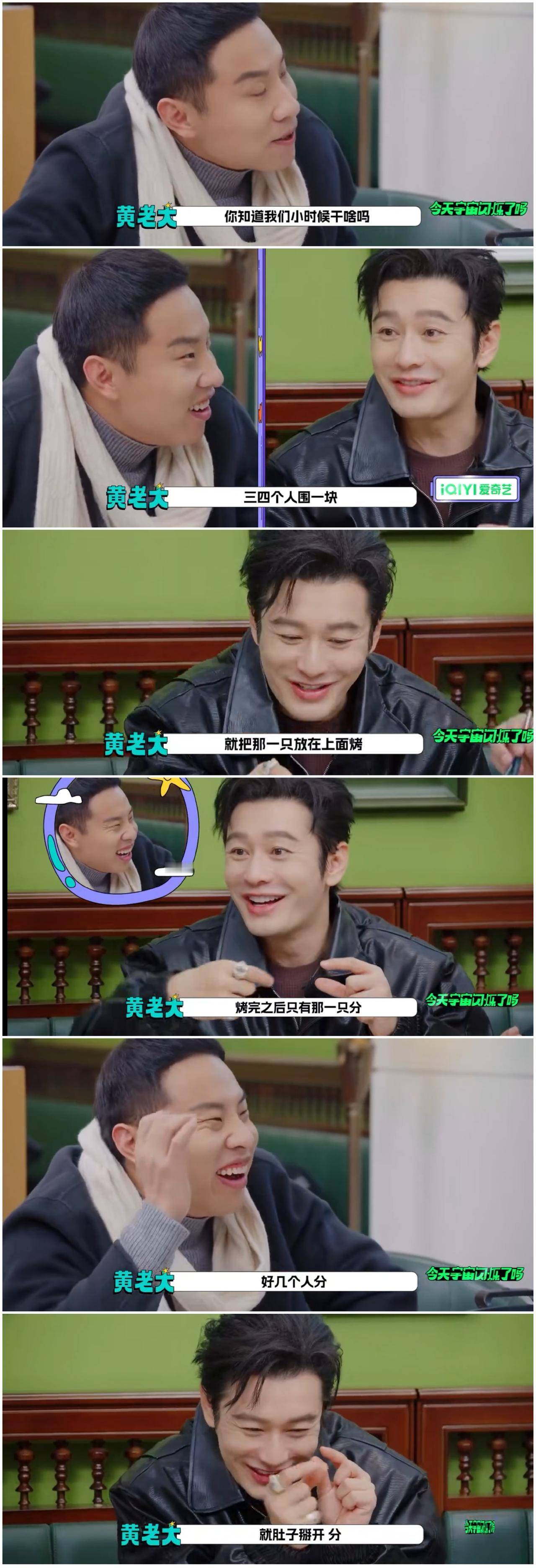 黄晓明也过过这样的日子, 徐志胜听后, 欲言又止。 徐志胜跟黄晓明聊起知了, 黄晓明这下开始滔滔不绝。 黄晓明谈及小的时候, 就四五个小伙伴就抓了一只知了, 反而各种兴奋, 找来砖头,纸,干草, 就这样烤一只知了, 烤熟后把肚子掰开 大家分着吃。 黄晓明讲述这段经历 脸上满是笑意。 完全不觉得那个是苦日子。 黄晓明曾坦言他家里的经济状况不好, 他妈妈就经常到渔船上捡来虾头, 回家煮着吃, 对于当时的味道印象深刻, 对于虾有着别样的感情。 是呀, 当时物质匮乏, 但是人们都说变着法从中找到乐趣, 把食物最大化利用, 当这些成为过去时, 人们看到的不是苦, 而是那段时光的单纯与美好。