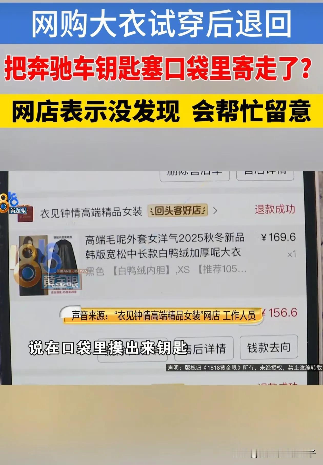 配一把奔驰车钥匙这么贵? 浙江女子网购大衣,退货时将奔驰车钥匙落在口袋里,重配要6000元,女子让商家帮忙寻找并退回,商家说没看到,如果发现了会还给女子。 女子真是大意,试穿一下大衣,怎么就把重要东西放进兜里?真是把钥匙放进衣服兜里了吗?无论是扔掉衣服还是收到衣服,都应该掏掏兜,看看有没有“意外之喜”。 女子都开上奔驰了,还穿100多块的大衣,还七天无理由退款,开奔驰也白嫖?