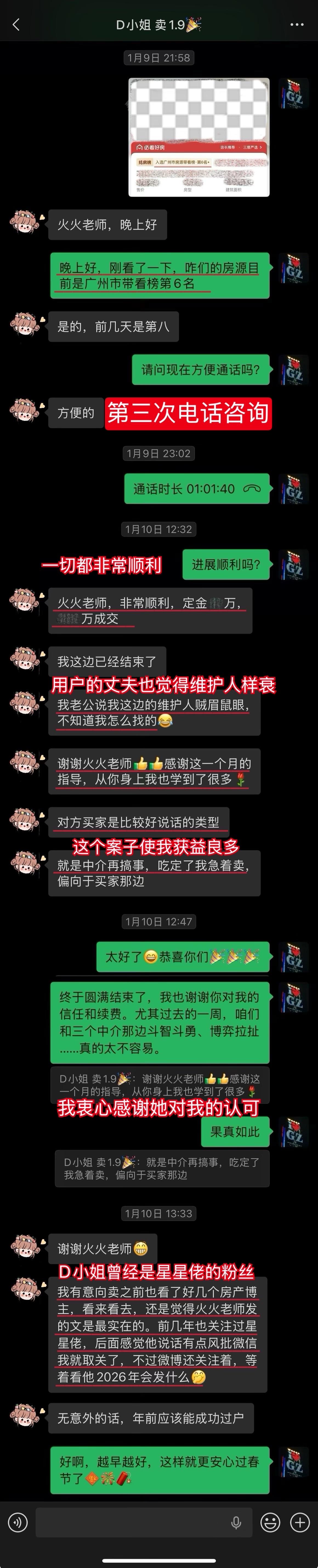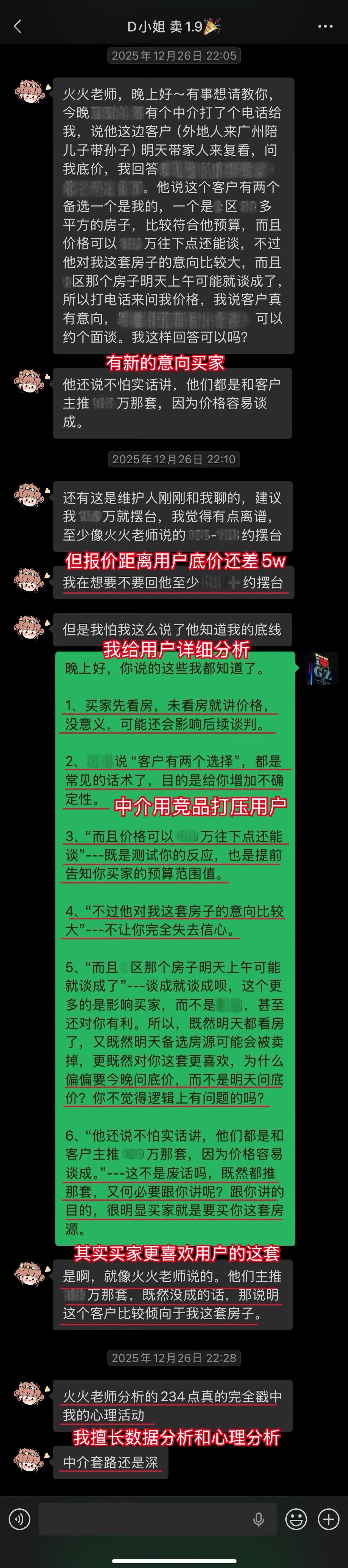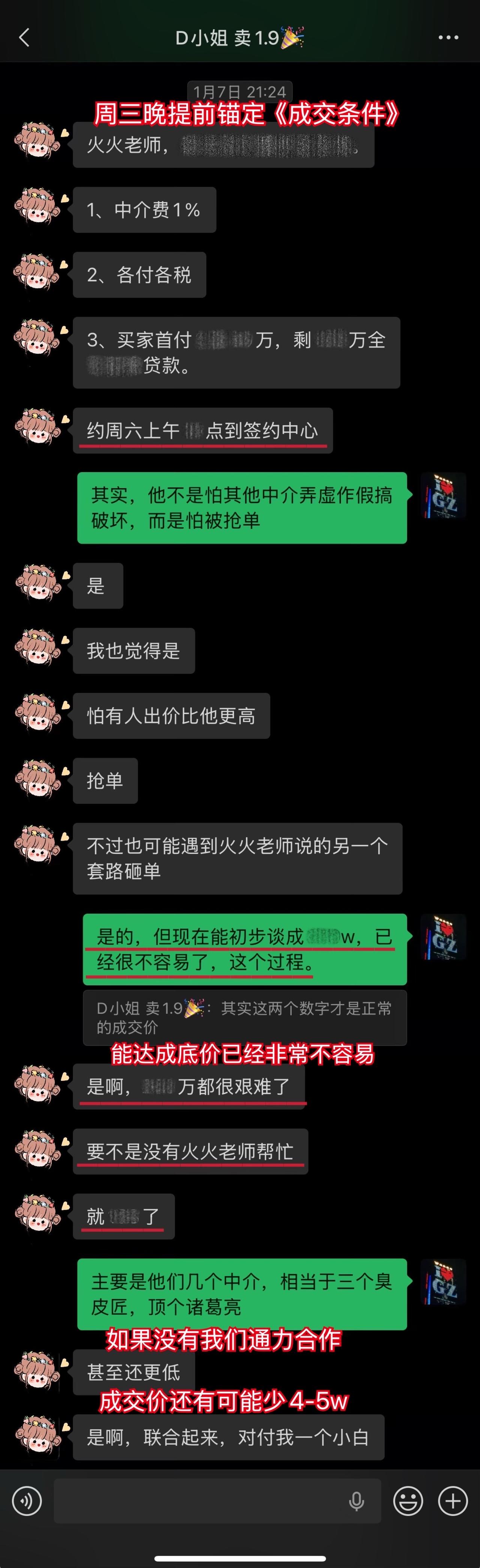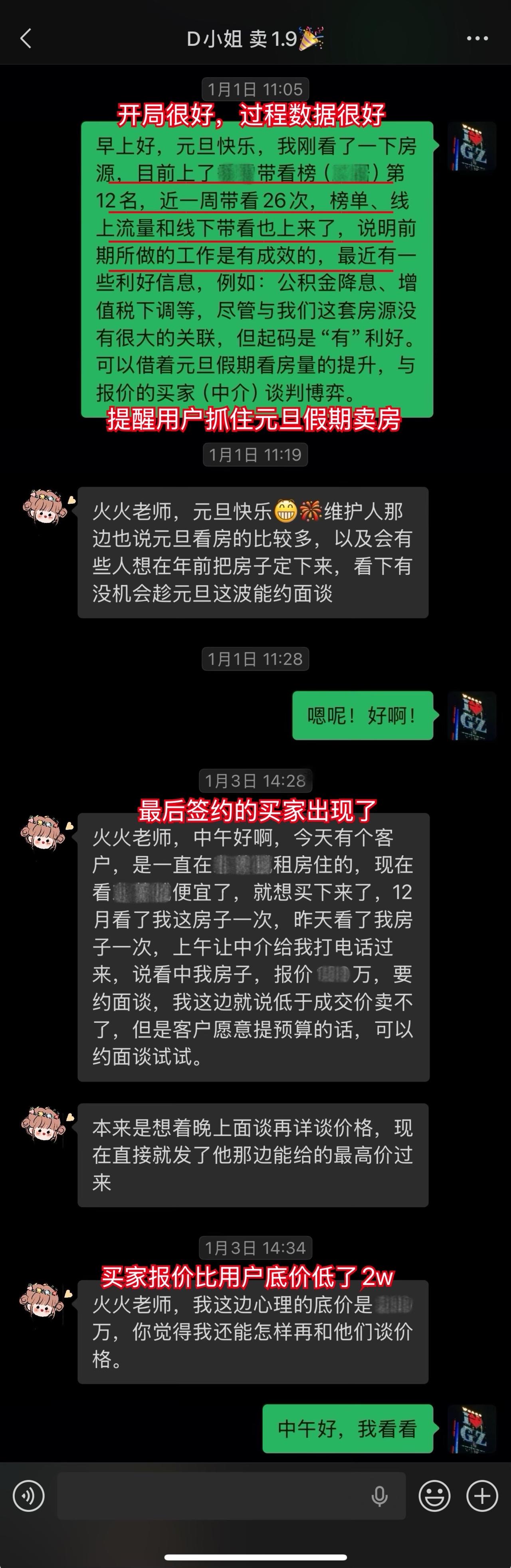 【卖房喜报044❤️】恭喜这位用户(D小姐),1月10日(周六)顺利卖出黄埔的房子。从房源正式对外展示到签约,仅20天。不仅避开了中介的套路、守住了底价,中介费还比预期低了0.5%,多省下了几万。预计2026年春节前就能收齐尾款。这个结果,我和用户都相当满意。 虽然成交周期较短,但过程还是比较曲折的。早在咨询前,D小姐就遇到过第一位意向买家伸出橄榄枝,但她当时没下定决心,错过了一次机会。咨询后,再遇上新买家时,她又有些低估中介的套路和博弈的难度。不然,这套房子其实可以更早卖掉。 我在指导过程中也费了不少心力。主要是维护人比较狡猾,一度取得了D小姐的信任。幸好我及时识破对方的把戏,持续给用户提供专业分析和信心支持,否则她很可能会落入维护人和其他中介联手做的局。 其实识破中介的套路并不算难,关键就两点:用户是否绝对信任我,以及是否及时同步真实详细的信息。只要这两点满足,我基本都能精准分析、及时出手。 谁的钱都不是大风刮来的。楼市下行期卖房本来就不好受,如果再被中介套路而多亏一笔钱,那真是雪上加霜。 我一直认为,帮用户其实也是在帮自己。如果用户能顺利卖出房子,并且卖到合适的价钱,这不正是我价值的体现吗?所以咨询这件事,是相衬相映、相互成就的。 回过头看,这个案子对我个人也极具里程碑意义。我从中得到不少新的启发,技战术能力又上了一个台阶,下次再遇到类似情况,我会处理得更从容、更到位。 我与D小姐前后进行了三次电话咨询,每次都有明确目标和针对性。 12月9日|第一次通话——卖房的第一阶段 用户情况比较特殊,我为此准备了两套方案,以便承接年底这波行情。 12月13日|房源挂牌 发现《方案一》走不通后,我立刻提醒用户启动《方案二》,并督促她尽快完成第一阶段工作。 12月21日|房源正式对外展示 D小姐执行力很强,从做完咨询到房源对外展示,只用了12天。期间我布置的三项任务,她都逐一落实了。 12月22日|房源登上“必看好房” 赶上12月多项利好释放,接下来的两周看房量很大,房源各项评分和排名也都靠前。 1月3日|进入卖房的第三阶段 分析评估后,我计划手把手指导用户博弈。为避免出什么岔子,我建议她续费。但用户觉得自己能应付,婉拒了我的续费邀请。 1月5日|第二次通话——正式指导博弈与拉扯 我识破了中介的谎言和套路,用户高度认同,当即续费。当时她仍比较紧张,我立刻通话全面分析形势、稳定信心,并手把手教她下一步应答的话术。 1月9日|第三次通话——签约前准备 虽然1月8日前已基本锚定成交条件,但中介套路太多,为确保万无一失,签约前一晚,我与D小姐及其先生做了第三次通话,指导他们如何应对,并推演中介(买家)可能的行为,避免对方临时反水。 1月10日|现场洽谈→细节敲定→成功签约 用户告诉我,预计2026年春节前就能收齐尾款。