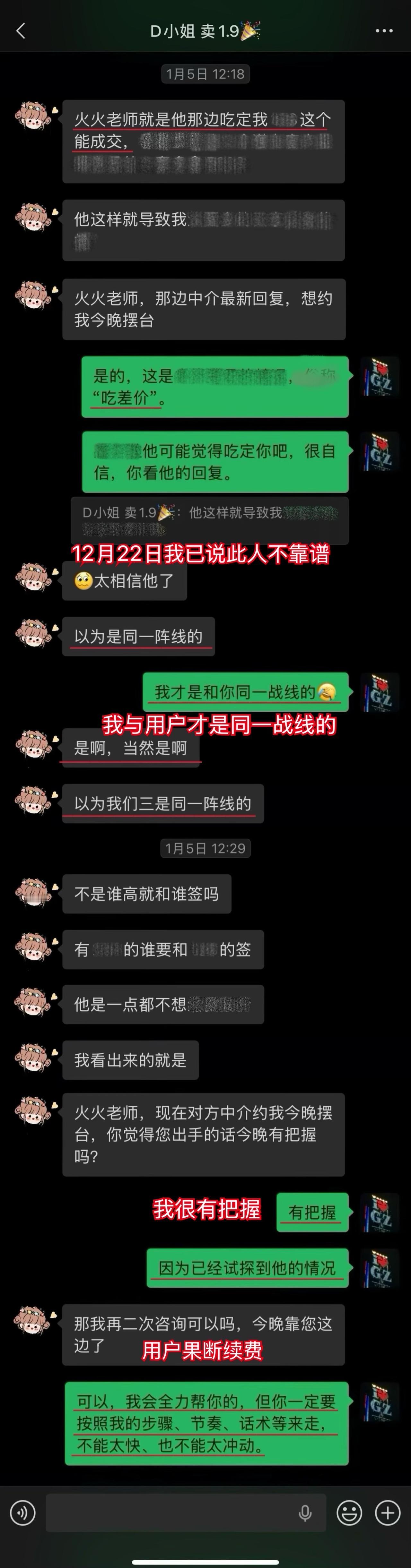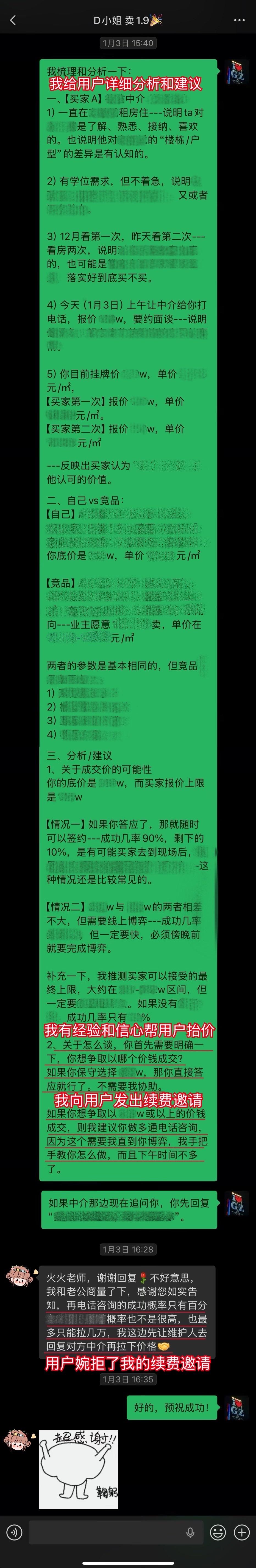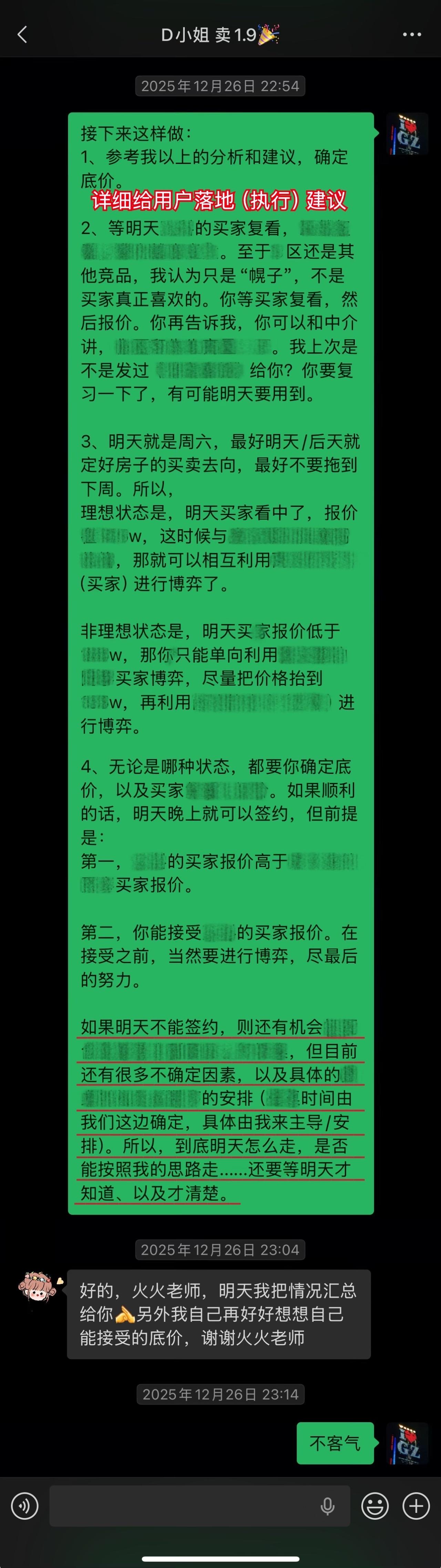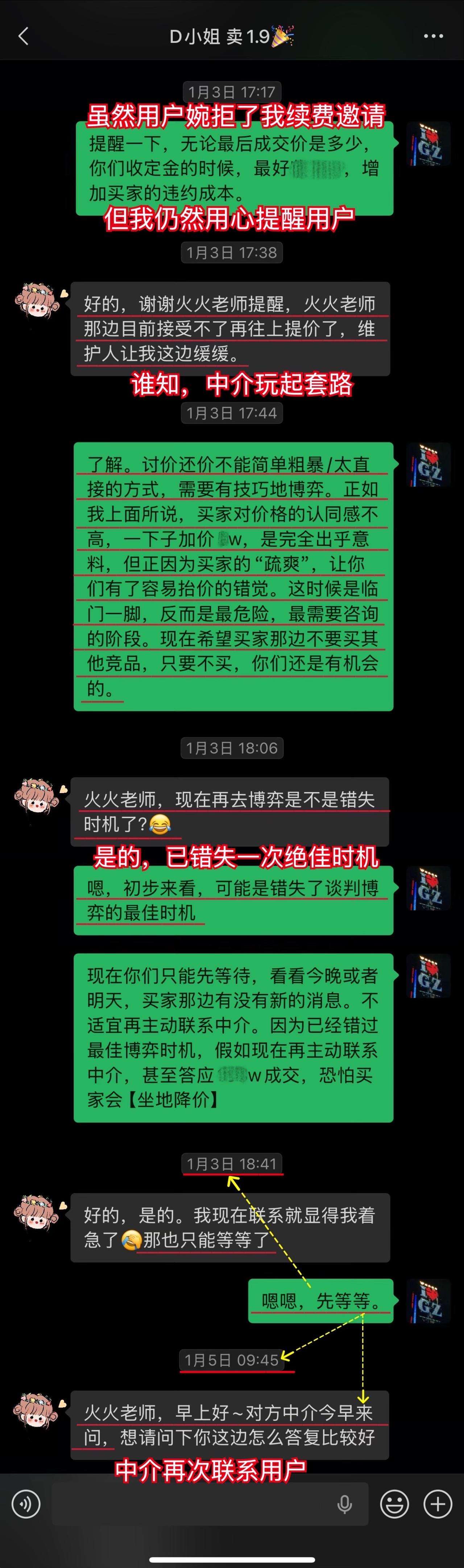 【卖房喜报044❤️】恭喜这位用户(D小姐),1月10日(周六)顺利卖出黄埔的房子。从房源正式对外展示到签约,仅20天。不仅避开了中介的套路、守住了底价,中介费还比预期低了0.5%,多省下了几万。预计2026年春节前就能收齐尾款。这个结果,我和用户都相当满意。 虽然成交周期较短,但过程还是比较曲折的。早在咨询前,D小姐就遇到过第一位意向买家伸出橄榄枝,但她当时没下定决心,错过了一次机会。咨询后,再遇上新买家时,她又有些低估中介的套路和博弈的难度。不然,这套房子其实可以更早卖掉。 我在指导过程中也费了不少心力。主要是维护人比较狡猾,一度取得了D小姐的信任。幸好我及时识破对方的把戏,持续给用户提供专业分析和信心支持,否则她很可能会落入维护人和其他中介联手做的局。 其实识破中介的套路并不算难,关键就两点:用户是否绝对信任我,以及是否及时同步真实详细的信息。只要这两点满足,我基本都能精准分析、及时出手。 谁的钱都不是大风刮来的。楼市下行期卖房本来就不好受,如果再被中介套路而多亏一笔钱,那真是雪上加霜。 我一直认为,帮用户其实也是在帮自己。如果用户能顺利卖出房子,并且卖到合适的价钱,这不正是我价值的体现吗?所以咨询这件事,是相衬相映、相互成就的。 回过头看,这个案子对我个人也极具里程碑意义。我从中得到不少新的启发,技战术能力又上了一个台阶,下次再遇到类似情况,我会处理得更从容、更到位。 我与D小姐前后进行了三次电话咨询,每次都有明确目标和针对性。 12月9日|第一次通话——卖房的第一阶段 用户情况比较特殊,我为此准备了两套方案,以便承接年底这波行情。 12月13日|房源挂牌 发现《方案一》走不通后,我立刻提醒用户启动《方案二》,并督促她尽快完成第一阶段工作。 12月21日|房源正式对外展示 D小姐执行力很强,从做完咨询到房源对外展示,只用了12天。期间我布置的三项任务,她都逐一落实了。 12月22日|房源登上“必看好房” 赶上12月多项利好释放,接下来的两周看房量很大,房源各项评分和排名也都靠前。 1月3日|进入卖房的第三阶段 分析评估后,我计划手把手指导用户博弈。为避免出什么岔子,我建议她续费。但用户觉得自己能应付,婉拒了我的续费邀请。 1月5日|第二次通话——正式指导博弈与拉扯 我识破了中介的谎言和套路,用户高度认同,当即续费。当时她仍比较紧张,我立刻通话全面分析形势、稳定信心,并手把手教她下一步应答的话术。 1月9日|第三次通话——签约前准备 虽然1月8日前已基本锚定成交条件,但中介套路太多,为确保万无一失,签约前一晚,我与D小姐及其先生做了第三次通话,指导他们如何应对,并推演中介(买家)可能的行为,避免对方临时反水。 1月10日|现场洽谈→细节敲定→成功签约 用户告诉我,预计2026年春节前就能收齐尾款。