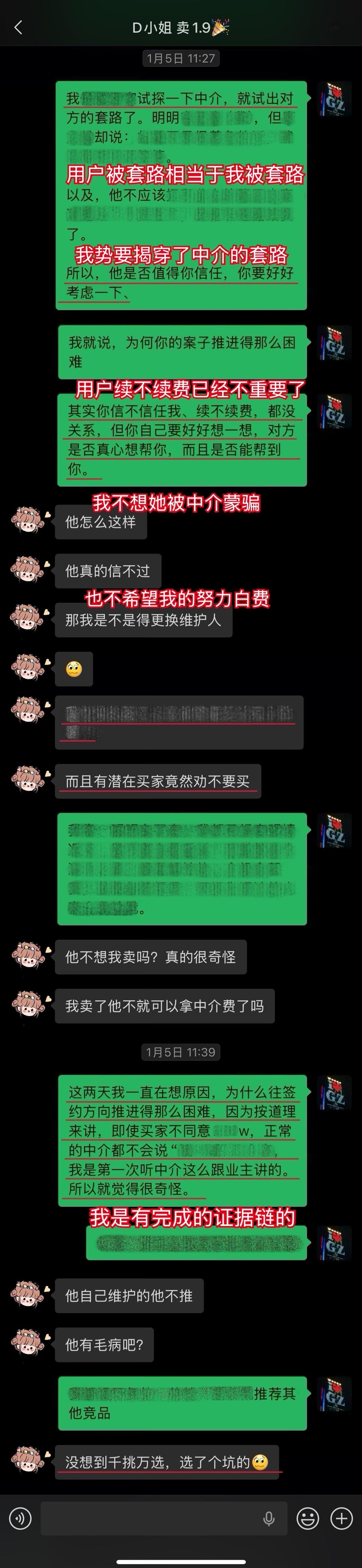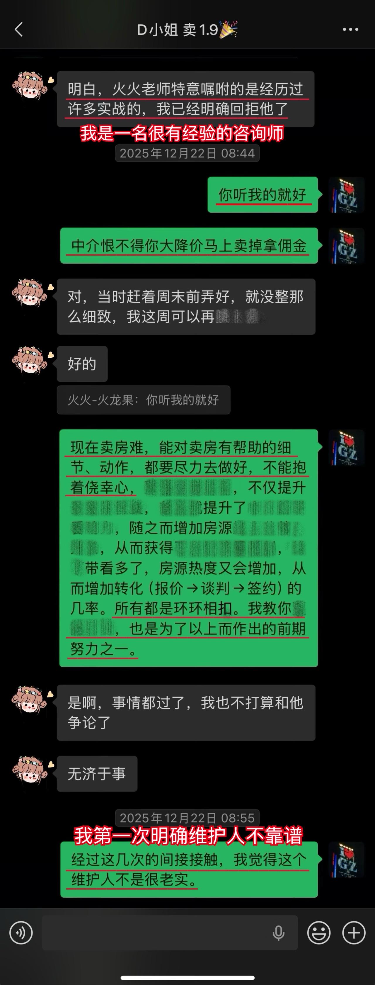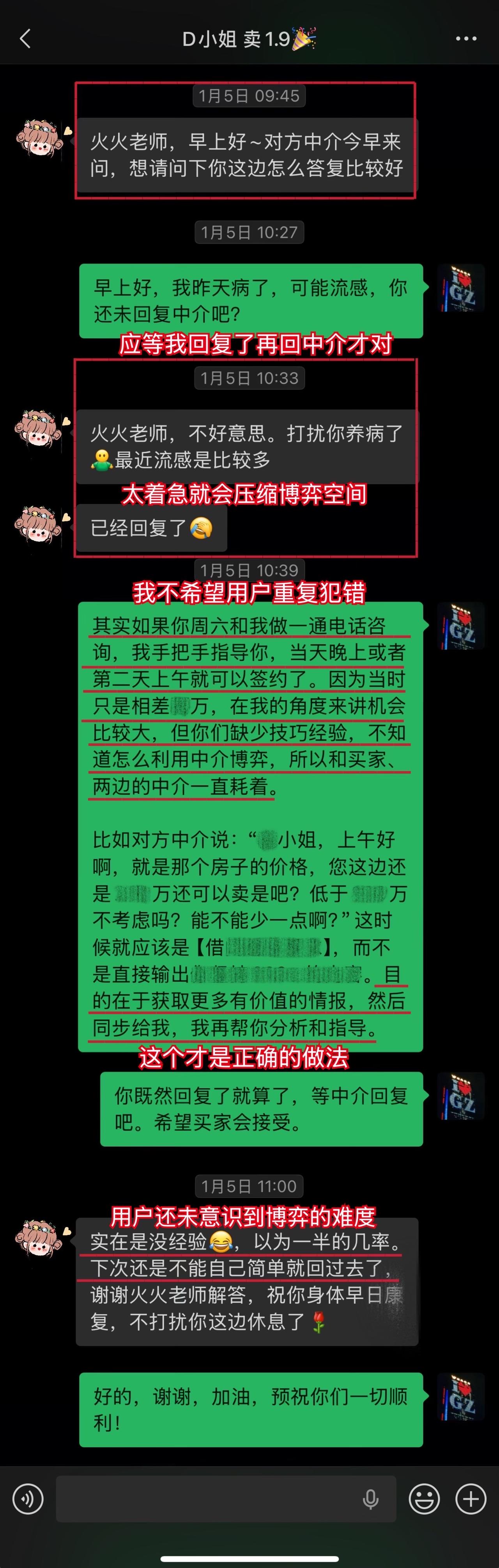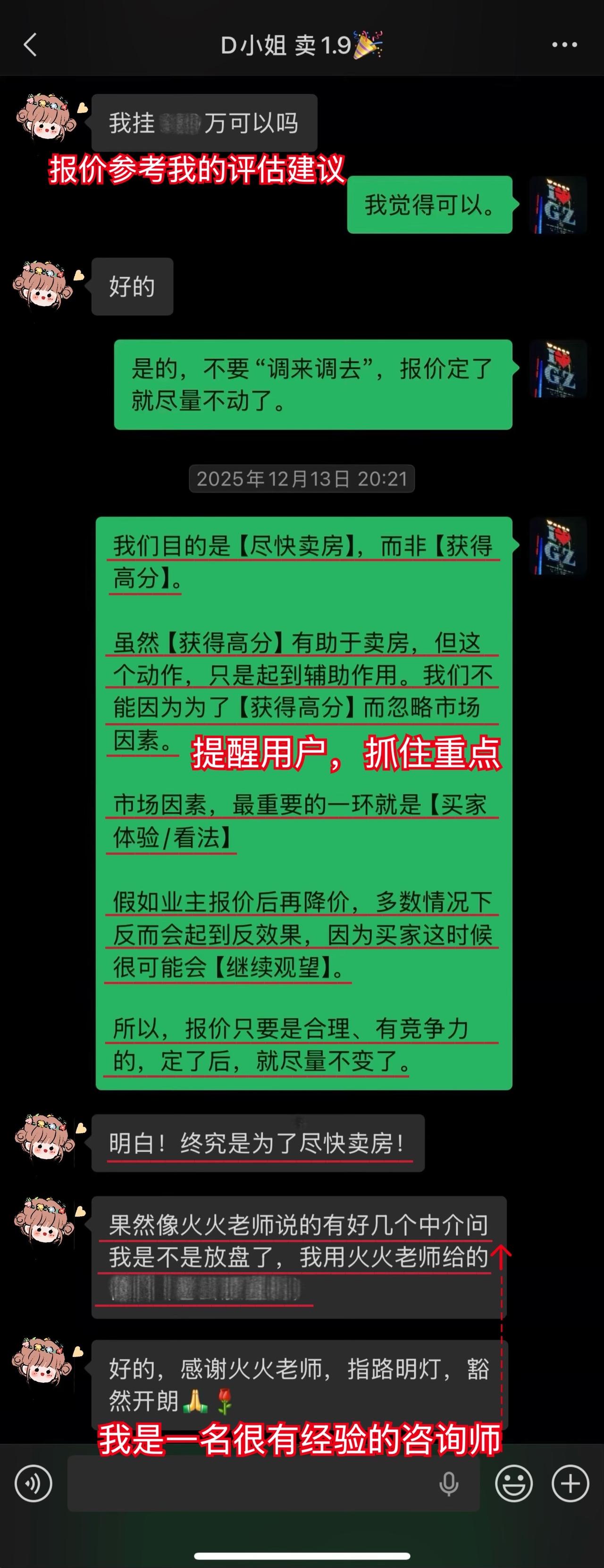 【卖房喜报044❤️】恭喜这位用户(D小姐),1月10日(周六)顺利卖出黄埔的房子。从房源正式对外展示到签约,仅20天。不仅避开了中介的套路、守住了底价,中介费还比预期低了0.5%,多省下了几万。预计2026年春节前就能收齐尾款。这个结果,我和用户都相当满意。 虽然成交周期较短,但过程还是比较曲折的。早在咨询前,D小姐就遇到过第一位意向买家伸出橄榄枝,但她当时没下定决心,错过了一次机会。咨询后,再遇上新买家时,她又有些低估中介的套路和博弈的难度。不然,这套房子其实可以更早卖掉。 我在指导过程中也费了不少心力。主要是维护人比较狡猾,一度取得了D小姐的信任。幸好我及时识破对方的把戏,持续给用户提供专业分析和信心支持,否则她很可能会落入维护人和其他中介联手做的局。 其实识破中介的套路并不算难,关键就两点:用户是否绝对信任我,以及是否及时同步真实详细的信息。只要这两点满足,我基本都能精准分析、及时出手。 谁的钱都不是大风刮来的。楼市下行期卖房本来就不好受,如果再被中介套路而多亏一笔钱,那真是雪上加霜。 我一直认为,帮用户其实也是在帮自己。如果用户能顺利卖出房子,并且卖到合适的价钱,这不正是我价值的体现吗?所以咨询这件事,是相衬相映、相互成就的。 回过头看,这个案子对我个人也极具里程碑意义。我从中得到不少新的启发,技战术能力又上了一个台阶,下次再遇到类似情况,我会处理得更从容、更到位。 我与D小姐前后进行了三次电话咨询,每次都有明确目标和针对性。 12月9日|第一次通话——卖房的第一阶段 用户情况比较特殊,我为此准备了两套方案,以便承接年底这波行情。 12月13日|房源挂牌 发现《方案一》走不通后,我立刻提醒用户启动《方案二》,并督促她尽快完成第一阶段工作。 12月21日|房源正式对外展示 D小姐执行力很强,从做完咨询到房源对外展示,只用了12天。期间我布置的三项任务,她都逐一落实了。 12月22日|房源登上“必看好房” 赶上12月多项利好释放,接下来的两周看房量很大,房源各项评分和排名也都靠前。 1月3日|进入卖房的第三阶段 分析评估后,我计划手把手指导用户博弈。为避免出什么岔子,我建议她续费。但用户觉得自己能应付,婉拒了我的续费邀请。 1月5日|第二次通话——正式指导博弈与拉扯 我识破了中介的谎言和套路,用户高度认同,当即续费。当时她仍比较紧张,我立刻通话全面分析形势、稳定信心,并手把手教她下一步应答的话术。 1月9日|第三次通话——签约前准备 虽然1月8日前已基本锚定成交条件,但中介套路太多,为确保万无一失,签约前一晚,我与D小姐及其先生做了第三次通话,指导他们如何应对,并推演中介(买家)可能的行为,避免对方临时反水。 1月10日|现场洽谈→细节敲定→成功签约 用户告诉我,预计2026年春节前就能收齐尾款。