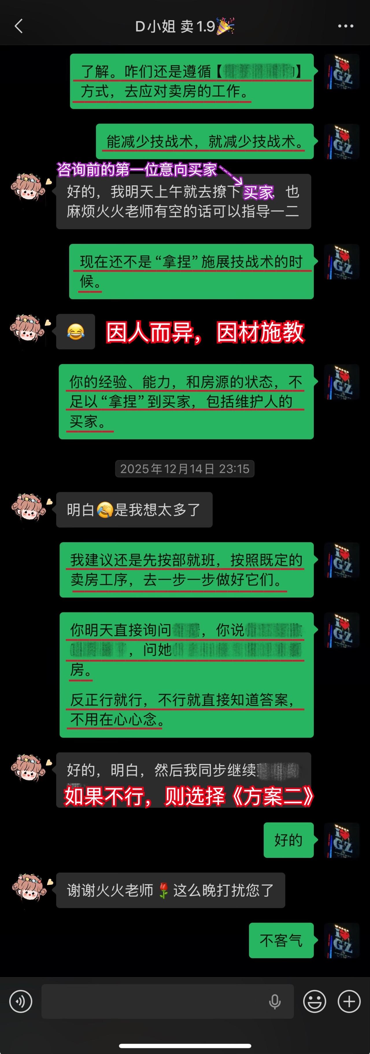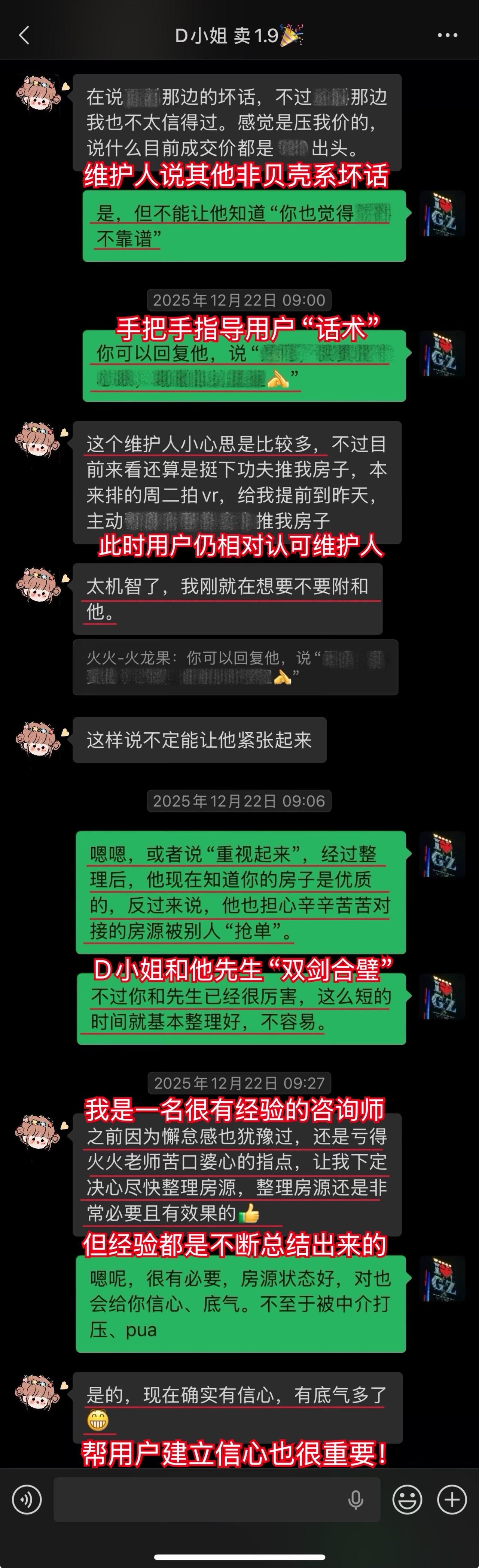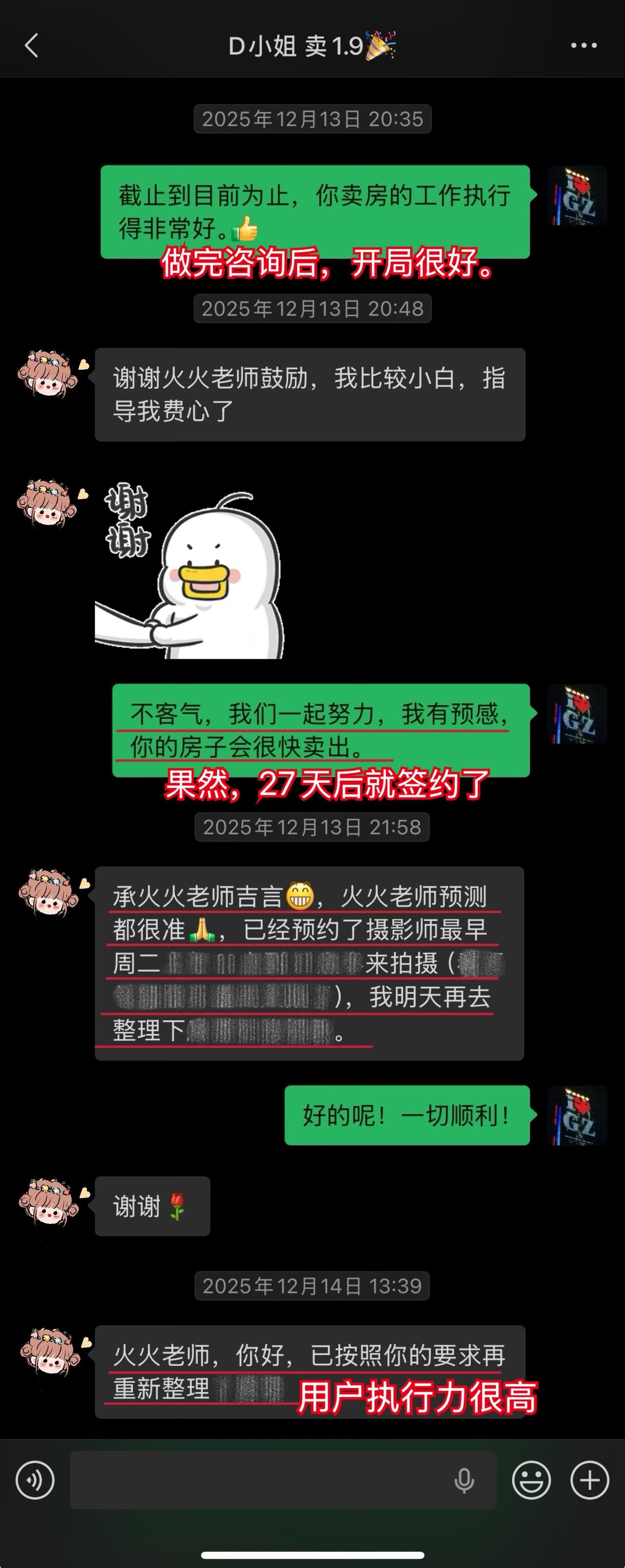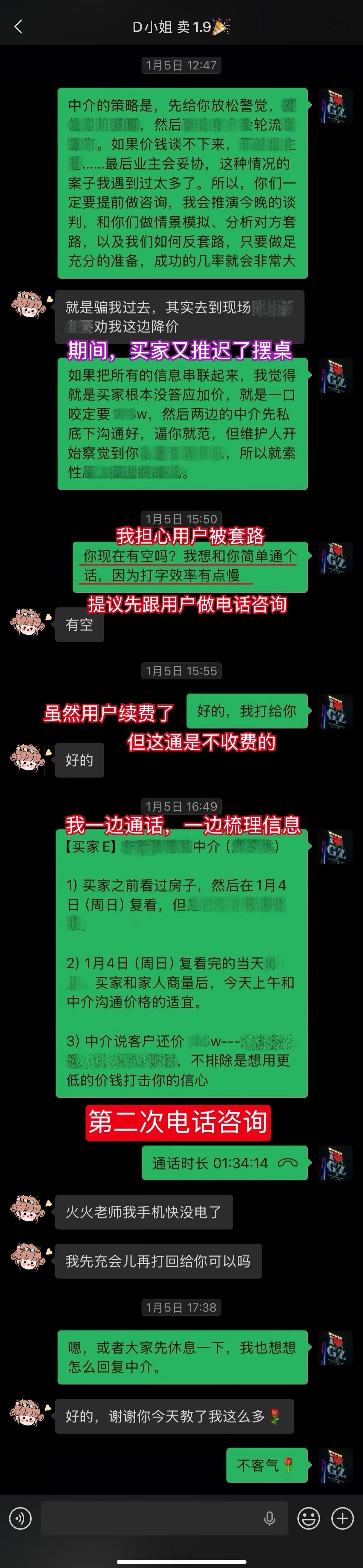 【卖房喜报044❤️】恭喜这位用户(D小姐),1月10日(周六)顺利卖出黄埔的房子。从房源正式对外展示到签约,仅20天。不仅避开了中介的套路、守住了底价,中介费还比预期低了0.5%,多省下了几万。预计2026年春节前就能收齐尾款。这个结果,我和用户都相当满意。 虽然成交周期较短,但过程还是比较曲折的。早在咨询前,D小姐就遇到过第一位意向买家伸出橄榄枝,但她当时没下定决心,错过了一次机会。咨询后,再遇上新买家时,她又有些低估中介的套路和博弈的难度。不然,这套房子其实可以更早卖掉。 我在指导过程中也费了不少心力。主要是维护人比较狡猾,一度取得了D小姐的信任。幸好我及时识破对方的把戏,持续给用户提供专业分析和信心支持,否则她很可能会落入维护人和其他中介联手做的局。 其实识破中介的套路并不算难,关键就两点:用户是否绝对信任我,以及是否及时同步真实详细的信息。只要这两点满足,我基本都能精准分析、及时出手。 谁的钱都不是大风刮来的。楼市下行期卖房本来就不好受,如果再被中介套路而多亏一笔钱,那真是雪上加霜。 我一直认为,帮用户其实也是在帮自己。如果用户能顺利卖出房子,并且卖到合适的价钱,这不正是我价值的体现吗?所以咨询这件事,是相衬相映、相互成就的。 回过头看,这个案子对我个人也极具里程碑意义。我从中得到不少新的启发,技战术能力又上了一个台阶,下次再遇到类似情况,我会处理得更从容、更到位。 我与D小姐前后进行了三次电话咨询,每次都有明确目标和针对性。 12月9日|第一次通话——卖房的第一阶段 用户情况比较特殊,我为此准备了两套方案,以便承接年底这波行情。 12月13日|房源挂牌 发现《方案一》走不通后,我立刻提醒用户启动《方案二》,并督促她尽快完成第一阶段工作。 12月21日|房源正式对外展示 D小姐执行力很强,从做完咨询到房源对外展示,只用了12天。期间我布置的三项任务,她都逐一落实了。 12月22日|房源登上“必看好房” 赶上12月多项利好释放,接下来的两周看房量很大,房源各项评分和排名也都靠前。 1月3日|进入卖房的第三阶段 分析评估后,我计划手把手指导用户博弈。为避免出什么岔子,我建议她续费。但用户觉得自己能应付,婉拒了我的续费邀请。 1月5日|第二次通话——正式指导博弈与拉扯 我识破了中介的谎言和套路,用户高度认同,当即续费。当时她仍比较紧张,我立刻通话全面分析形势、稳定信心,并手把手教她下一步应答的话术。 1月9日|第三次通话——签约前准备 虽然1月8日前已基本锚定成交条件,但中介套路太多,为确保万无一失,签约前一晚,我与D小姐及其先生做了第三次通话,指导他们如何应对,并推演中介(买家)可能的行为,避免对方临时反水。 1月10日|现场洽谈→细节敲定→成功签约 用户告诉我,预计2026年春节前就能收齐尾款。