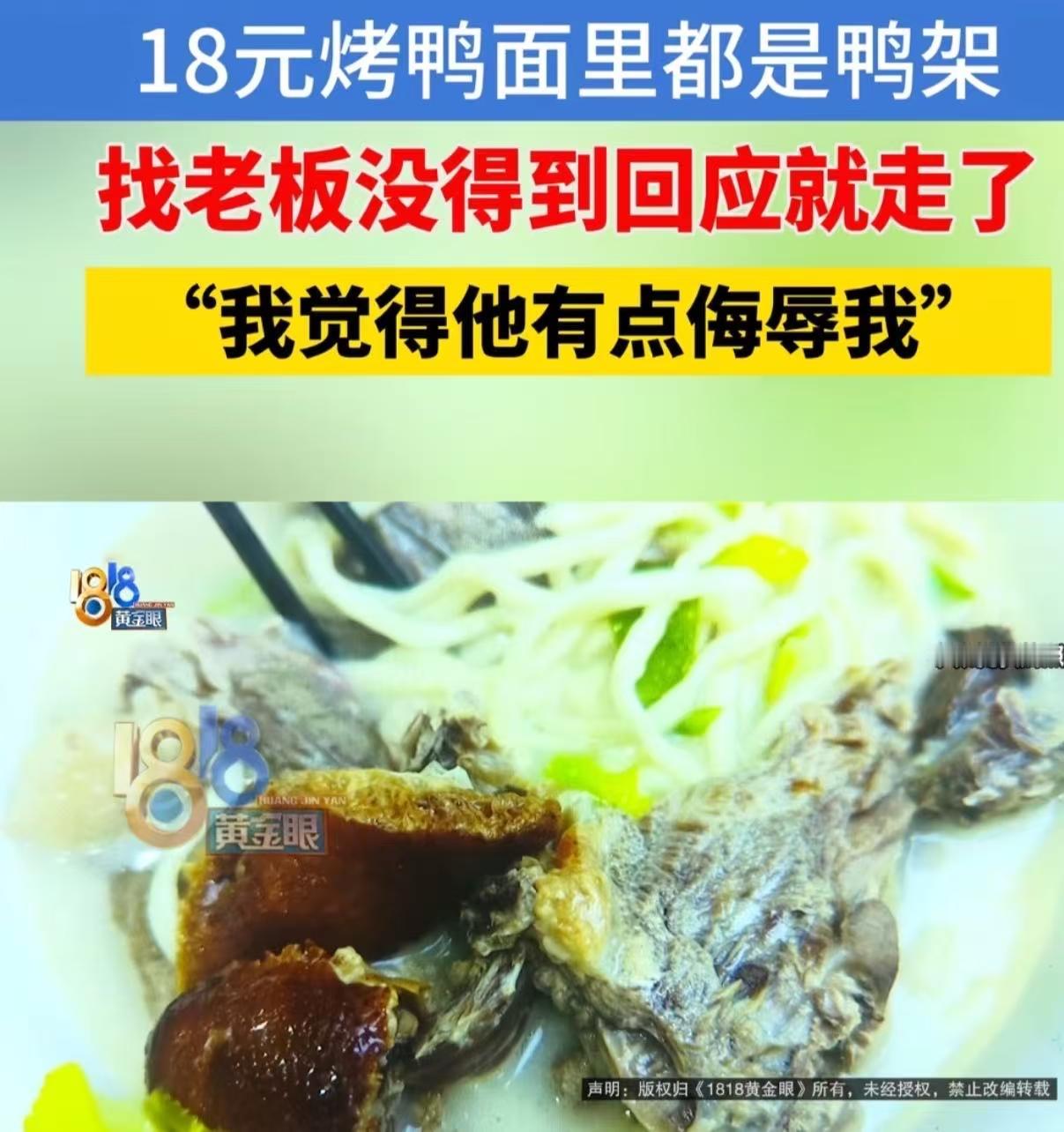 “现在的年轻人是真的会较真!”浙江杭州,小伙子面馆点了一碗烤鸭面,结果上面的面都是鸭架骨头,根本没吃到肉!小伙向老板反应,老板不理不睬,小伙感觉“有点侮辱”,请来媒体曝光!小伙:“我不要一分赔偿,就看不惯你欺骗消费者!” 晚上8点多,路过的小张被这张“视觉契约”拦住了脚步。海报之上,那金黄酥脆的鸭皮与大片厚实鸭肉层层铺陈,满满当当,仿佛在诉说着美味的诱惑。而一旁的标价,赫然写着18元。 作为一个资深吃货,小张脑海里瞬间完成了性价比评估:在杭州这个地界,18块钱能吃顿热乎的烤鸭面,这便宜得占。 但他万万没想到,这张美好的契约在十分钟后会被撕得粉碎。面端上来了。没有预想中的肉山肉海,碗里横七竖八躺着的,是粗大的鸭骨架、厚得发腻的鸭皮,甚至还有完整的鸭脖子。 别说大块肉了,拿筷子翻个底朝天,连点碎肉末都像是在跟你玩捉迷藏。这哪是吃面?这分明是在给鸭子做尸检。 火气一下子就上来了。小张端着碗去找男老板要说法。如果这时候老板说句软话,哪怕解释一句“厨师手抖了”,事情可能也就过去了。 但老板选择了最糟糕的应对方式:沉默。他低头忙着手里的活,仿佛面前这个端着一碗骨头的年轻人是空气。 这种无声的傲慢,比那一碗鸭骨头更让人难以此下咽。小张觉得自己的智商被按在地上摩擦。他没动那碗面,也没大吵大闹,只是冷静地掏出手机,把这碗“卖家秀”拍了下来,转身走进了夜色里。 这一走,就把事情捅到了聚光灯下。面对镜头,小张的态度硬得像块石头:“我不要一分钱赔偿,我就要个公道。” 当媒体介入,这碗面的商业逻辑底裤终于被扒了下来。老板娘在对质中说了实话:这些鸭子根本不是店里采购的食材,而是源自她丈夫工作的高档酒店。 在那边的餐桌上,食客们吃完了昂贵的片皮鸭,剩下的鸭架是没人要的“厨余垃圾”。但在面馆老板眼里,这是从天而降的“金矿”。酒店的废料,到了面馆就摇身一变,成了招牌上的“烤鸭面”。 网友们把算盘珠子拨得噼里啪啦响:原料成本无限趋近于零,这一碗卖18块,简直就是无本万利的暴利收割机。 他们管这叫“物尽其用”,可小张管这叫“赤裸裸的欺诈”。这才是双方博弈的真正核心——命名权。 小张在对峙中抛出的逻辑非常清醒:你可以卖骨头,没人拦着你,但你不能挂着“烤鸭面”的招牌卖骨头。 你应该叫它“鸭架面”,或者“鸭骨汤面”。一字之差,就是知情权和欺骗的界限。在铁一般的事实面前,商家终于低头了,承诺立刻修改菜单和宣传图。但这事儿在网上并没有就此平息,反而撕裂出了两种截然不同的声音。 有人在评论区冷嘲热讽:“才18块钱,你还想要自行车?现在的年轻人真难伺候。”这种论调听着耳熟吗?仿佛只要价格便宜,消费者就活该放弃对质量的底线要求,“图片仅供参考”成了商家合法的免死金牌。 但反过来看,如果每个人都像这些“宽容”的看客一样,怕麻烦、嫌事儿多,那我们的餐桌最后会变成什么样?恐怕到时候,不仅是“烤鸭面”里没鸭肉,连“牛肉面”里可能都只剩下一股牛味儿了。 小张的这次“较真”,其实是在给麻木的市场做电击治疗。他放弃了经济索赔,甚至不在乎那顿饭钱,他争的是那张被撕碎的“视觉契约”必须重新拼好。在这个充斥着“差不多得了”的商业江湖里,像小张这样死磕到底的“愣头青”,不是太多,而是太少了。 毕竟,如果连“挂羊头卖狗骨”都能被默许为商业潜规则,那才是我们所有人最大的悲哀。