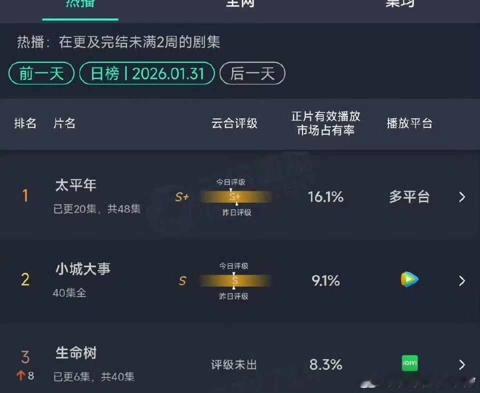 1月31号云合,杨紫《生命树》占比8.3%,次日翻了两倍多!👍🏻