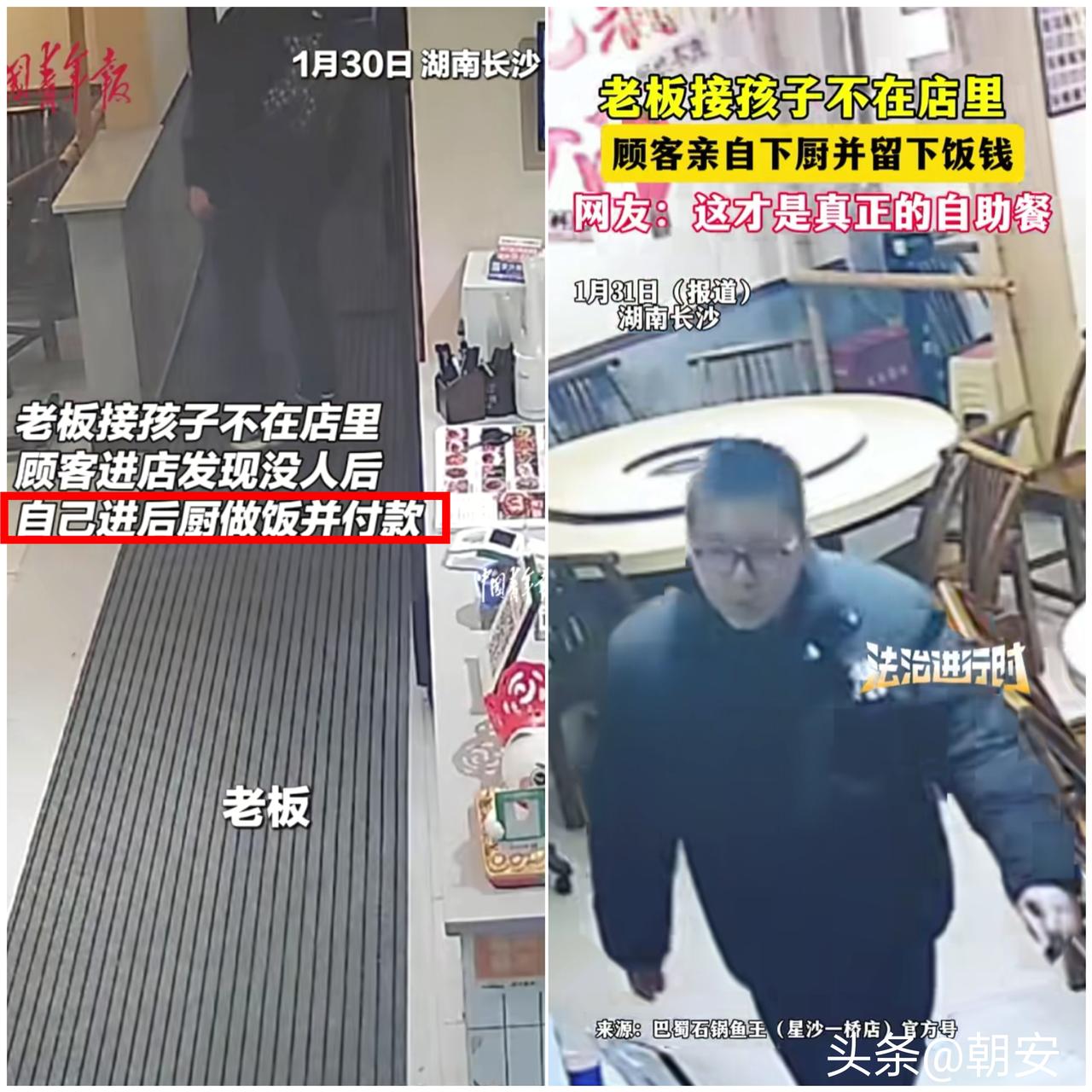 谁能想到! 一家没锁门、没人看店的餐馆,反而照出了最实在的人心。 湖南长沙这位餐馆老板,临时去接孩子没锁店门,想着时间短不会有客人,回去却发现桌上摆着用过的碗筷,当场一头雾水,调完监控直接被暖到。 一位食客进店没找到老板,喊了几声没人应,干脆自己进厨房炒了蛋炒饭和辣椒炒肉,吃饱喝足后,对着菜单算好价格,当着监控放好55块钱,还特意出声说明,全程自觉又坦荡。 很多人觉得这操作又搞笑又离谱,可这根本不是胡闹,而是人与人之间最舒服的信任。 老板敢敞店离开,是笃定街坊邻里的厚道;顾客不白吃、不自作主张,是守住了做人的底线。 比起那些精致的客套,这种不设防的相处、不占便宜的自觉,才是生活里最珍贵的温暖。 这哪里是自助吃饭,分明是一场双向的诚信奔赴。 你遇见过这种让人心里一暖的诚信小事吗,来评论区说说吧。