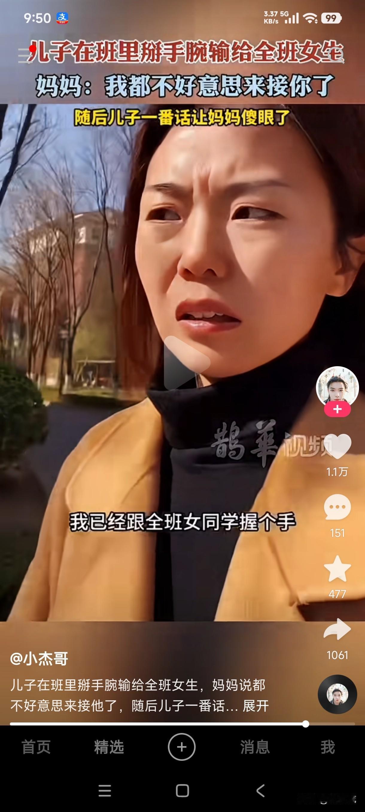 儿子在班里和同学掰手腕输给全班女生,妈妈嫌弃儿子丢脸都不好意思接他,结果儿子的一句话顿时让妈妈傻眼,他是故意输给全班女生的,目的就是为了和全班女生握手。 这句话让当妈的听了后也大惊失色,别人都是为了掰赢同学,而他却是为了故意输给女同学,目的居然是为了和女学生握手,这孩子可能是全班唯一一个和所有女同学握手的男生了,妈妈听后他说的话瞬间也不觉得丢脸了,这儿子的情商还是高人一等的,居然会想出来这么个办法,这当娘的立即对儿子刮目相看了,这以后是不是不愁儿子找不到对象了?