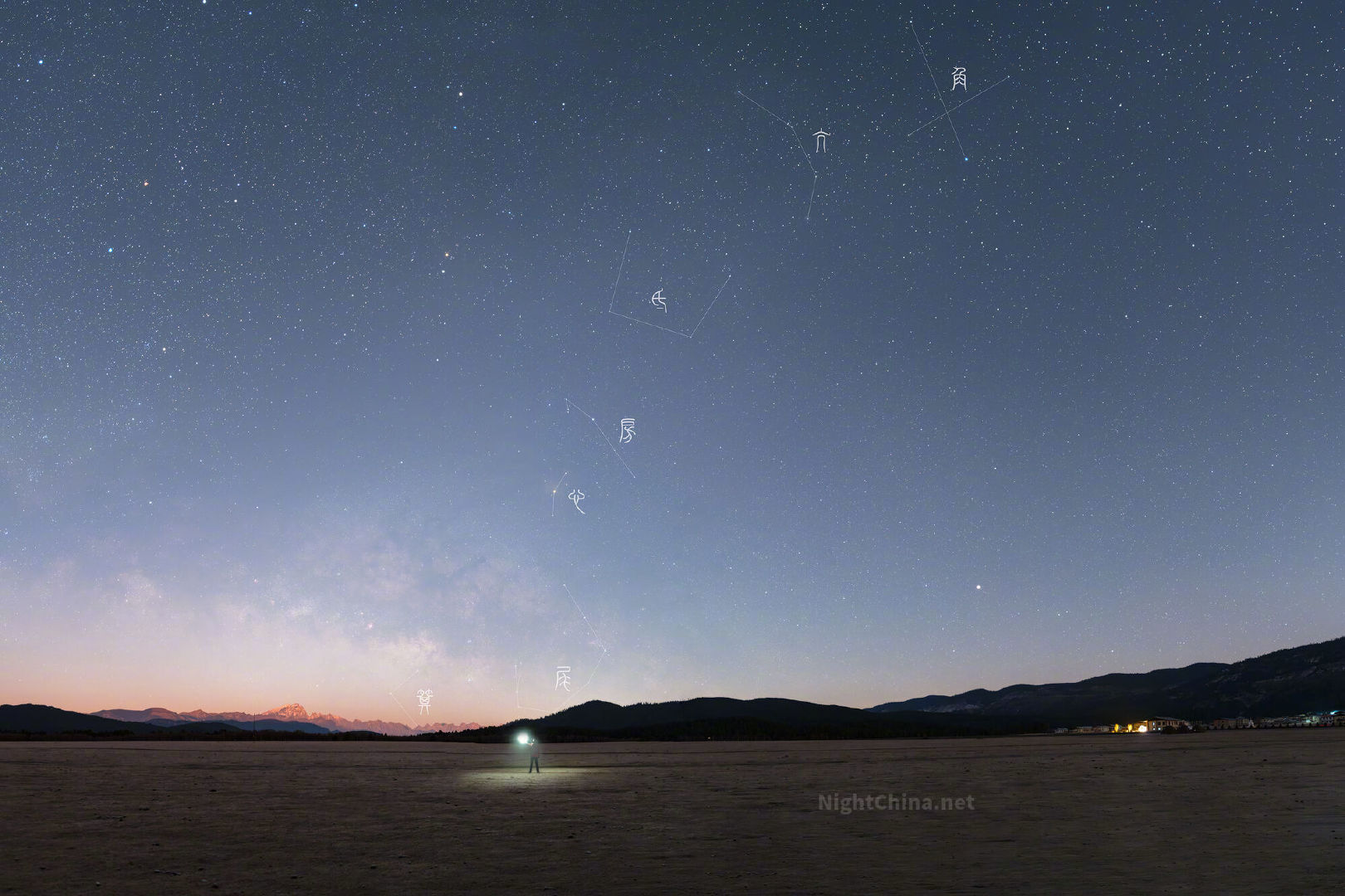 当盈凸月缓缓沉入地平线,清冷的月光为哈巴雪峰镀上一层璀璨的金边。与此同时,东方的天幕正被古老的星光唤醒——角、亢、氐、房、心、尾、箕,东方苍龙七宿在海拔5396米的巅峰之上次第舒醒。流云在寒风中凝固,时间仿佛在这一刻结晶,唯有连绵的龙脊背负着岁月的刻度,在星穹的静默里,静候宇宙深处的低吟。