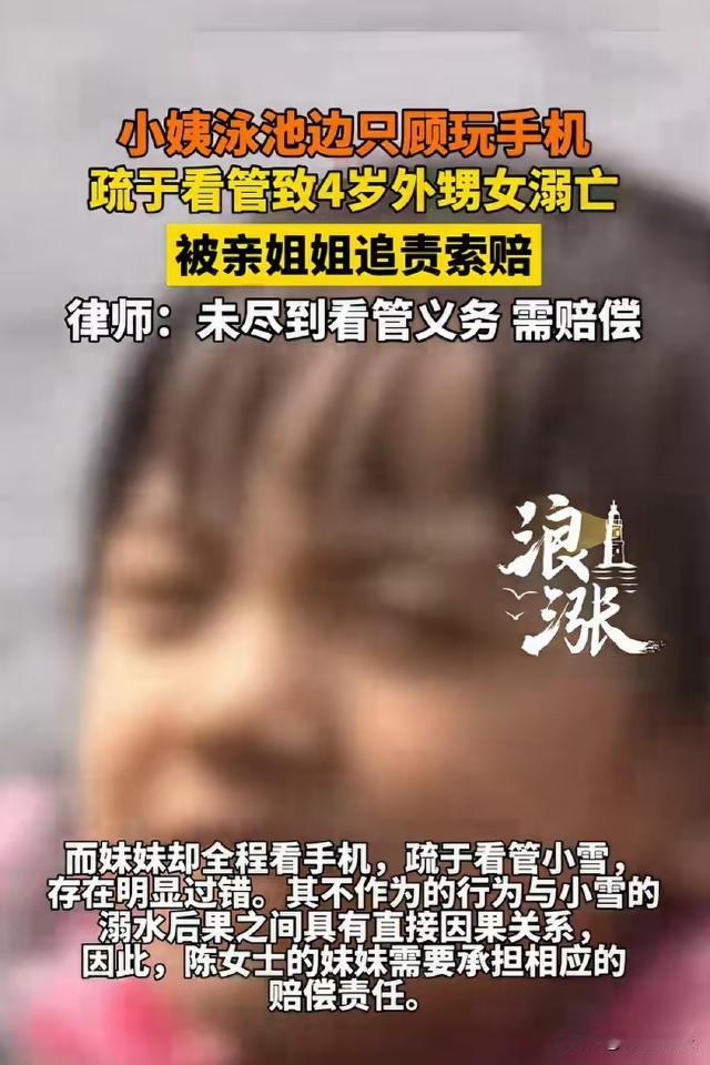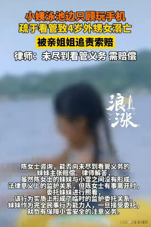女子带妹妹和4岁女儿出去玩,还特意花高价定了一个有游泳池的民宿。期间女子有事要出去,让妹妹帮忙看一下女儿,谁知道妹妹只顾玩手机,外甥女掉进泳池里溺毙了。事后,女子又悲又气,要起诉妹妹索赔。 据浪涨新闻报道,不久前,陈女士趁着休假带4岁的女儿出去玩,因为陈女士和妹妹的感情比较好,所以又带上妹妹一起。 陈女士的妹妹年纪也不小了,可还是和个孩子一样贪玩得不行,陈女士没少说她,可说轻了不管用,说重了妹妹又不高兴。 为了让这趟旅行更舒心,陈女士特意定了一家带有游泳池的民宿。 果然,这个举动深得妹妹的欢心,她这个年纪的女孩子,现在正流行吃“漂亮饭”,住高档有氛围的酒店。 刚一安顿下来,陈女士的妹妹就闲不住了,到处拍照片,风景照、自拍照,一张又一张拍个没完。 陈女士看着妹妹,简直是又好气又好笑。 休假期间,陈女士突然接到公司电话,让她紧急处理一连重要事情。 情况紧急,陈女士只好临时离开,先去处理工作。临走前,她再三嘱咐妹妹,要好好看着她4岁的女儿。 妹妹不耐烦地说:知道了姐,你现在怎么跟咱妈一样,也这么啰嗦?你就放心吧,4岁的孩子我还能看不了吗? 陈女士得到妹妹的保证,这才放心离开,可让她没想到的是,她一走,一大一小两个人就彻底放飞自我了。 没有姐姐在旁边管教,陈女士的妹妹就像脱了线的风筝,她又是和朋友聊天,又是发视频炫耀,一时之间将4岁的外甥女忘记了。 陈女士的女儿非常懂事,缠了小姨一会,看她不理自己,小姑娘就自己去外面了,结果意外就这么发生了。 陈女士的妹妹玩了半天手机,突然想起来,外甥女怎么半天没来烦自己了? 俗话说小孩静悄悄,必定在作妖,陈女士的妹妹还以为外甥女正在搞破坏,可她喊了半天外甥女的名字,小姑娘一直没答应。 陈女士的妹妹有点慌了,她在房间里找了一圈,又去外面找,结果一眼就看见外甥女静静躺在泳池底部。 陈女士得到消息后差点疯了,民宿老板也赶了过去。 陈女士发现,泳池四周没有围栏,也没有安全警示标志,存在一定安全隐患。 而根据依据《民法典》第一千一百九十八条规定,宾馆、商场、银行、车站、机场、体育场馆、娱乐场所等经营场所、公共场所的经营者、管理者或者群众性活动的组织者,未尽到安全保障义务,造成他人损害的,应当承担侵权责任。 民宿老板提供带有游泳池的住宿服务,他就是这个经营场所的管理者,对入住的客人有安全保障义务。 可实际情况是,泳池四周既没有围栏,也没有安全警示标志,明显存在安全隐患,而这种安全措施的缺失,和陈女士女儿溺亡有一定因果关系。 所以,民宿老板自知自己没尽到安全保障义务,主动承担了部分赔偿责任。 但事情并没有完,事后陈女士仔细询问了妹妹,又查看了监控,又这发现从自己走后,妹妹就只顾着玩手机,根本没有好好看管自己的女儿。 陈女士又气又痛,觉得这件事自己妹妹也脱不了干系,于是咨询律师,想要让妹妹也承担一定责任。 那么,陈女士的妹妹是否应该承担责任呢? 陈女士有事离开,把女儿委托给妹妹照看,这就形成了一个临时的委托监护关系。 虽然陈女士的妹妹不是法定监护人,但在陈女士委托期间,她有义务保障孩子的安全。 《民法典》第一千一百六十五条规定,行为人因过错侵害他人民事权益造成损害的,应当承担侵权责任。 陈女士的妹妹在接受委托后,只顾着玩手机,完全忘记了照看外甥女,没有履行好委托监护的职责,存在明显过错,而她的这种疏忽和孩子溺 亡有直接的因果关系。 所以,陈女士的妹妹应该为自己的过错行为承担相应责任。 俗话说婴儿不离手,幼儿不离眼,看孩子责任最大。 陈女士4岁的女儿确实太可惜了,但有人认为,妹妹也是亲人,陈女士的妹妹又不是有心的,陈女士要起诉妹妹,以后还怎么来往? 也有人认为,如果是无心之失,确实不应该计较,陈女士的女儿如果是磕了碰了,她肯定不会追究,但是这件事显然就是妹妹没尽心尽力,这才导致了悲剧发生。 陈女士到底应不应该追究妹妹的责任?您怎么看?