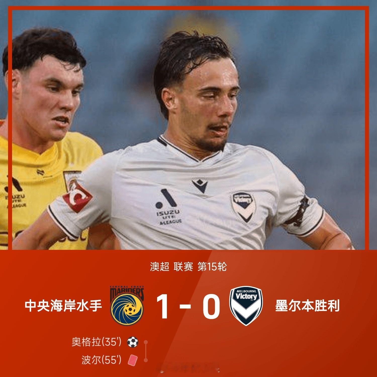 25/26赛季澳超联赛第15轮,中央海岸水手1-0战胜墨尔本胜利。上半场比赛,奥格拉突施冷箭首开记录,随后比赛因闪电暂停大约一小时。下半场易边再战,波尔破坏单刀机会染红,墨尔本胜利苦攻无果,最终吞下败仗。