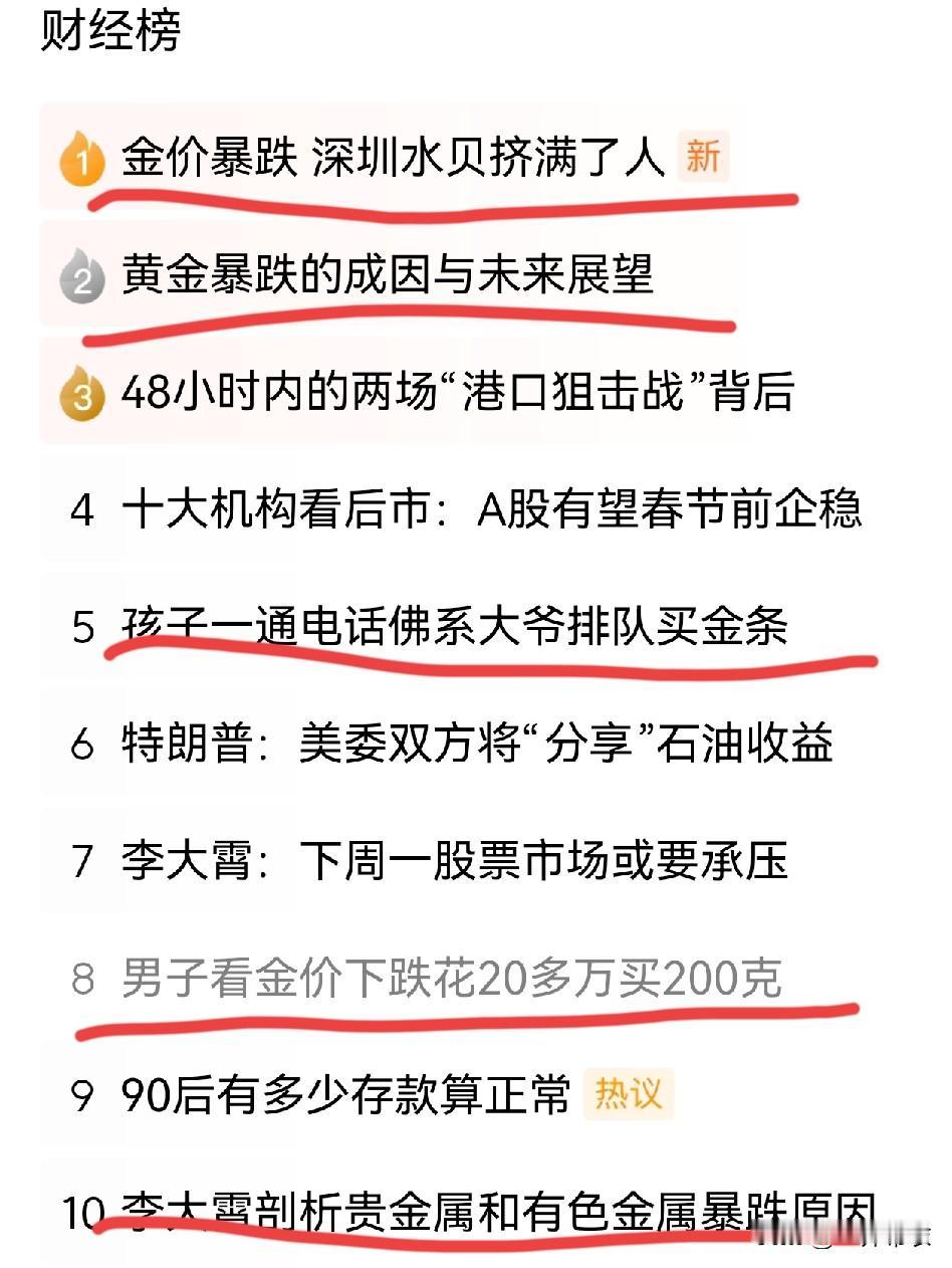 财经榜,前十热搜有5个在讲黄金。 我怎么感觉,明天黄金很有可能,先跌后涨。 1、全球大放水的趋势没有变,黄金依旧是那个相对保值的资产。 2、世界地缘政治危机,未来还会持续很长的时间。 一次大跌,行情就结束不太可能,长期逻辑没变,黄金依旧会涨回来。