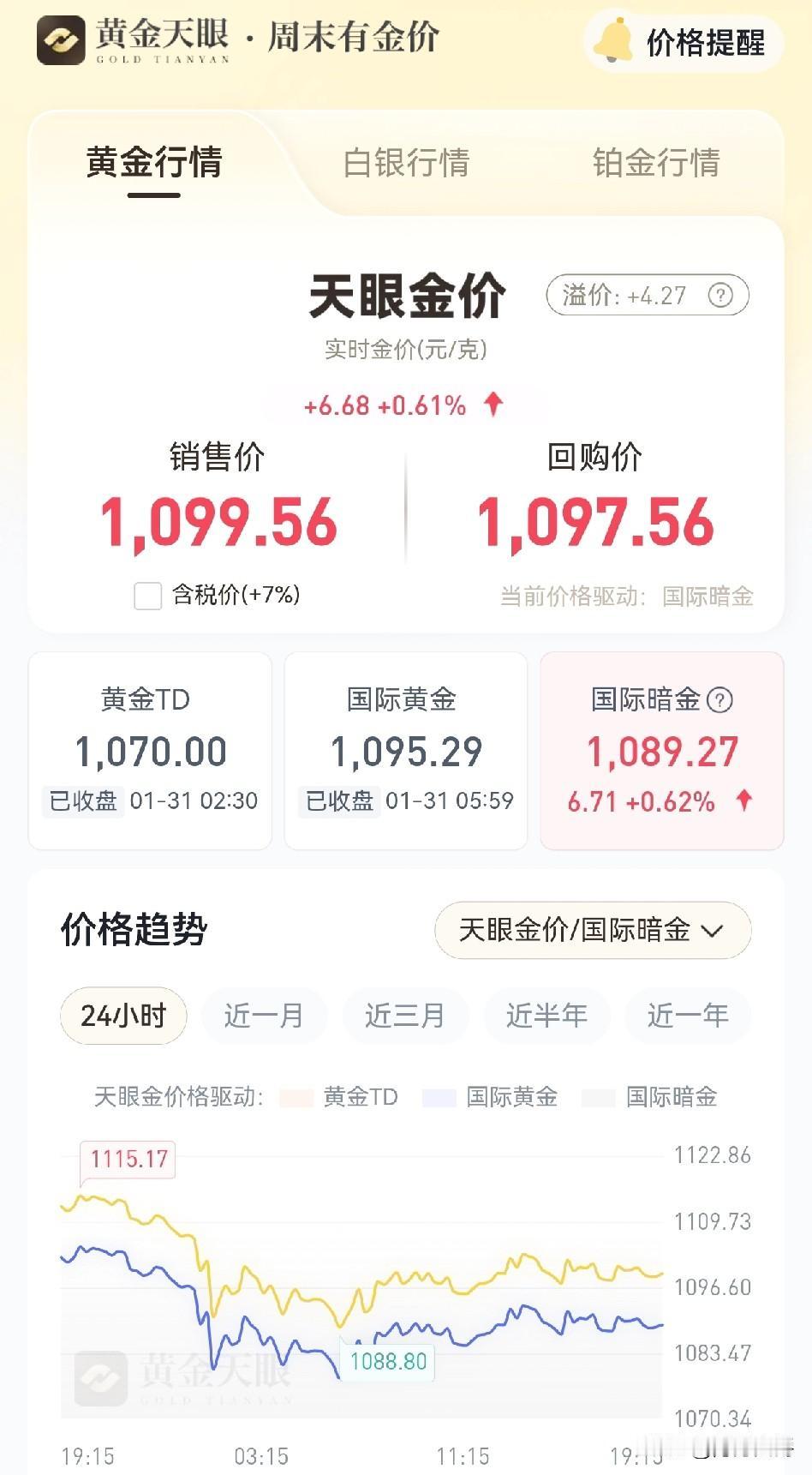周末最新时实金价, 大家放心过周末吧! 和我预测的一致,小幅平稳上涨。 不用揣着煎熬等到周一看开盘了。最新实时金价,2月1日晚7:30,1099元/克,上涨0.6%。 黄金上涨的国际大趋势没有改变,突然的下跌确实把人吓一跳,被挂树上的朋友不要割肉套现,稍等一下,机会还是有的,怎么样咱也要弄个回本吧!