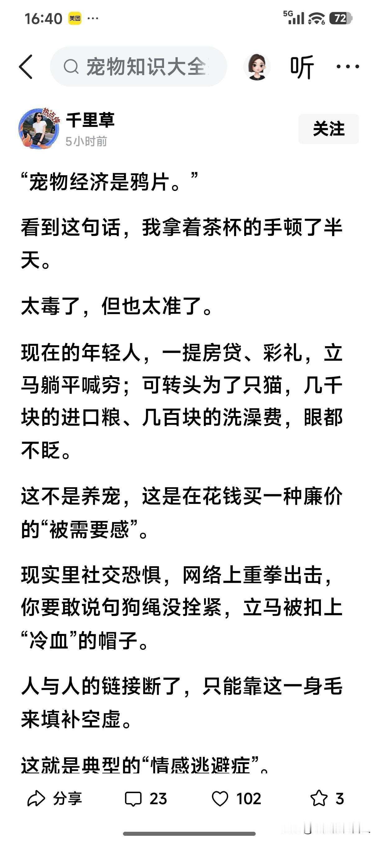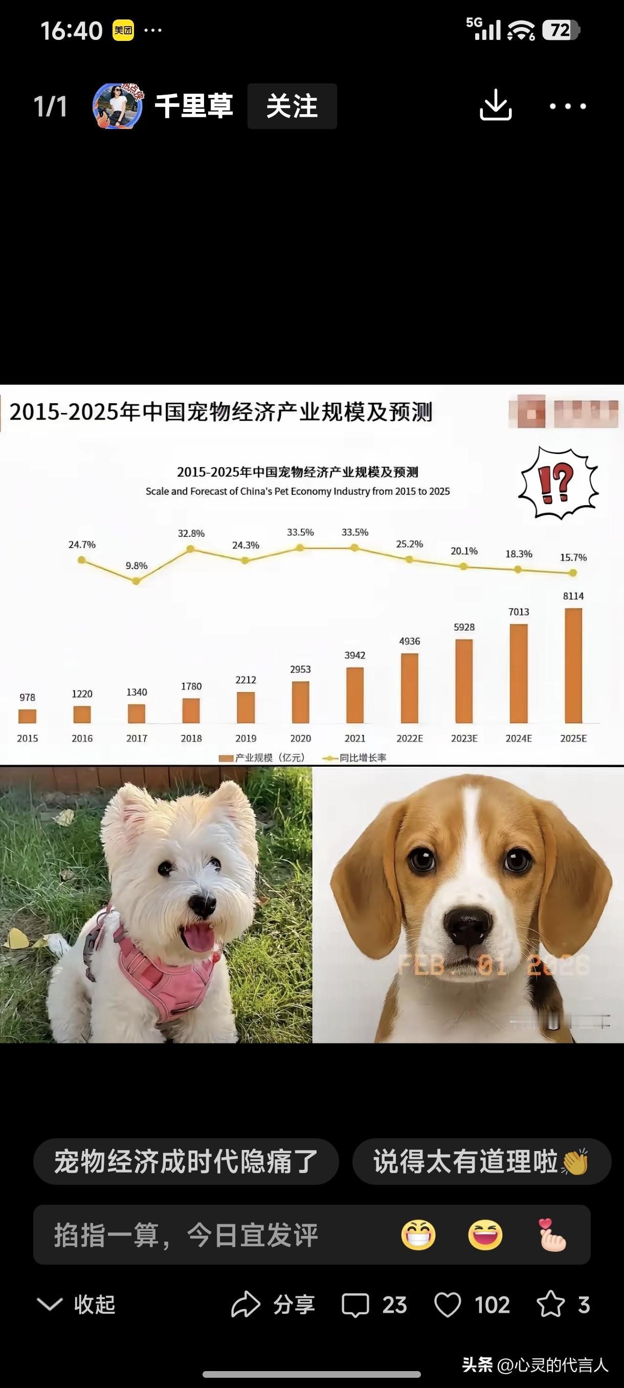 “宠物经济是鸭片”! 网上有人说“宠物经济是鸭片”,这话说的很重,太过于偏激了。 这些年宠物经济发展迅猛,如今已经形成了规模庞大的经济链,带动了很多跟宠物有关的产业发展,也解决了很多人的就业问题,让更多的人走上了发家致富的道路。 至于人狗之间的冲突,养狗人和居民之间的矛盾与纷争,只是少数养狗人病态宠爱、过分宠惯的后果。 随着国家出台各种养宠法律法规,文明养狗、和谐养狗的日子很快会来到。真心希望广大的养狗人都能自觉做到文明养狗,不扰民、爱护小区环境卫生。