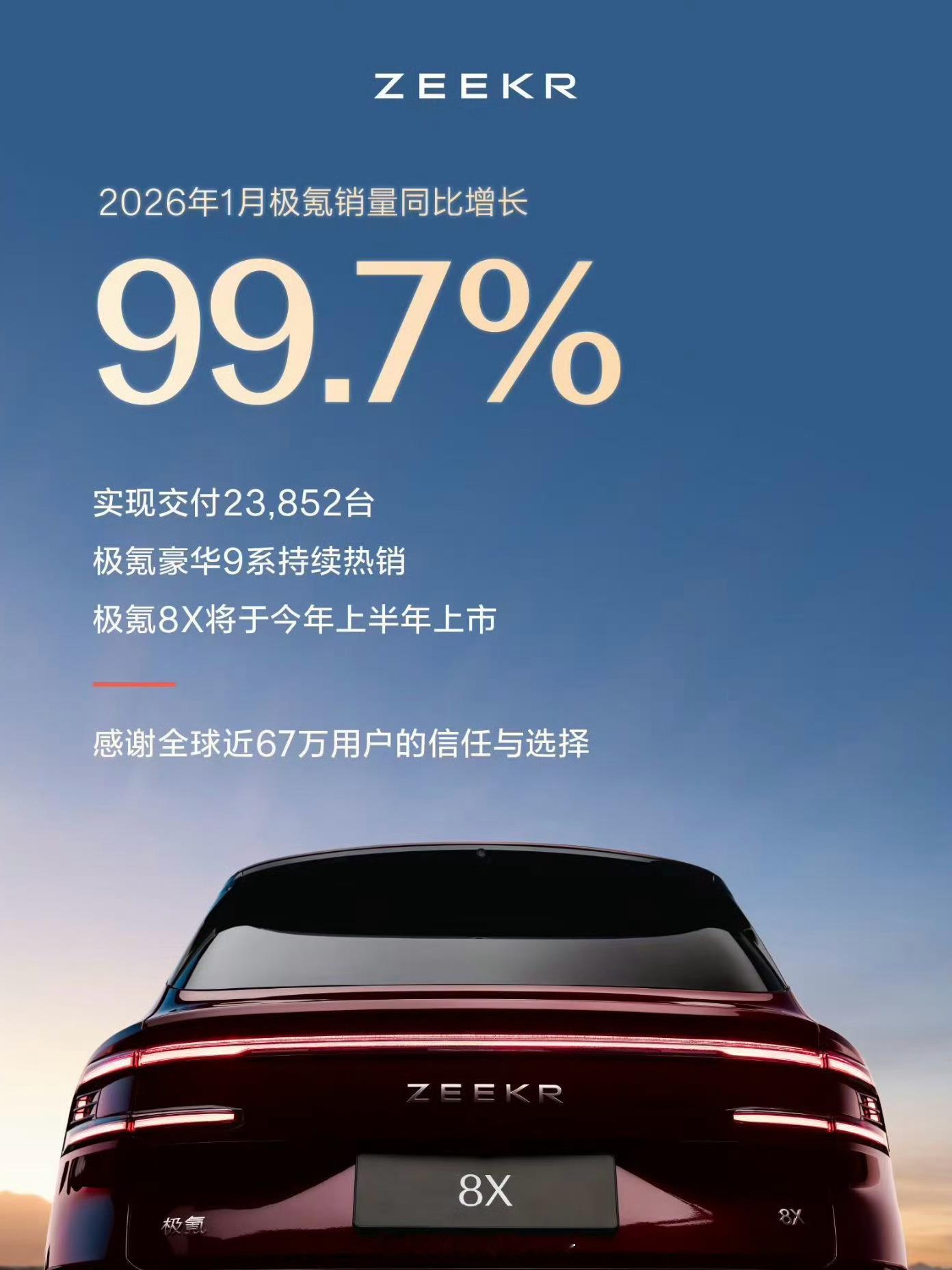 2026年1月极氪交付23852台同比增长99.7%极氪8X今年上半年上市