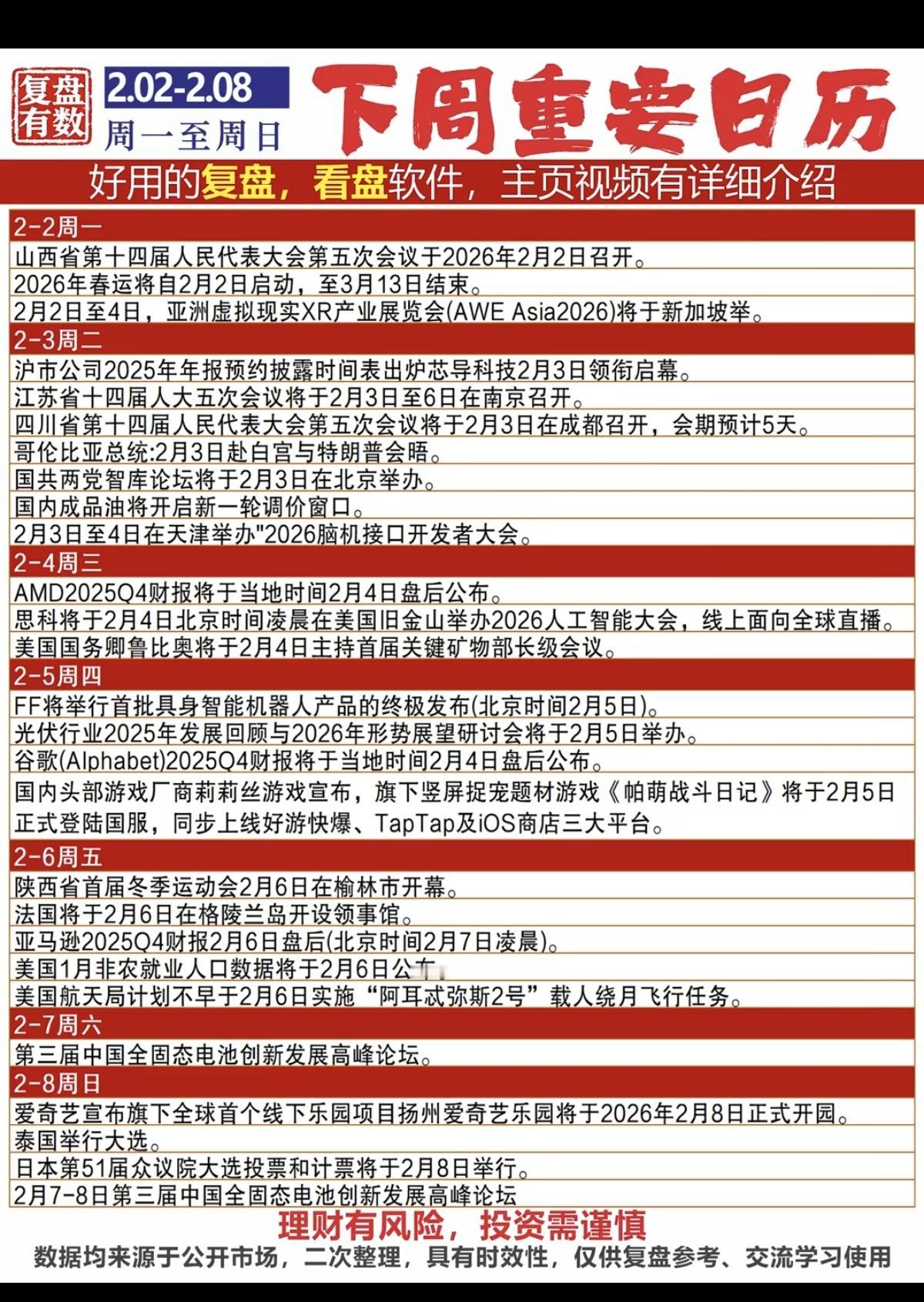 (2.02~2.08)下周重要财经日历! 相关重要财经会议和时间节点。 涉及固态电池,脑机接口,机器人,非农就业人数,半导体虚拟现实等关联题材。