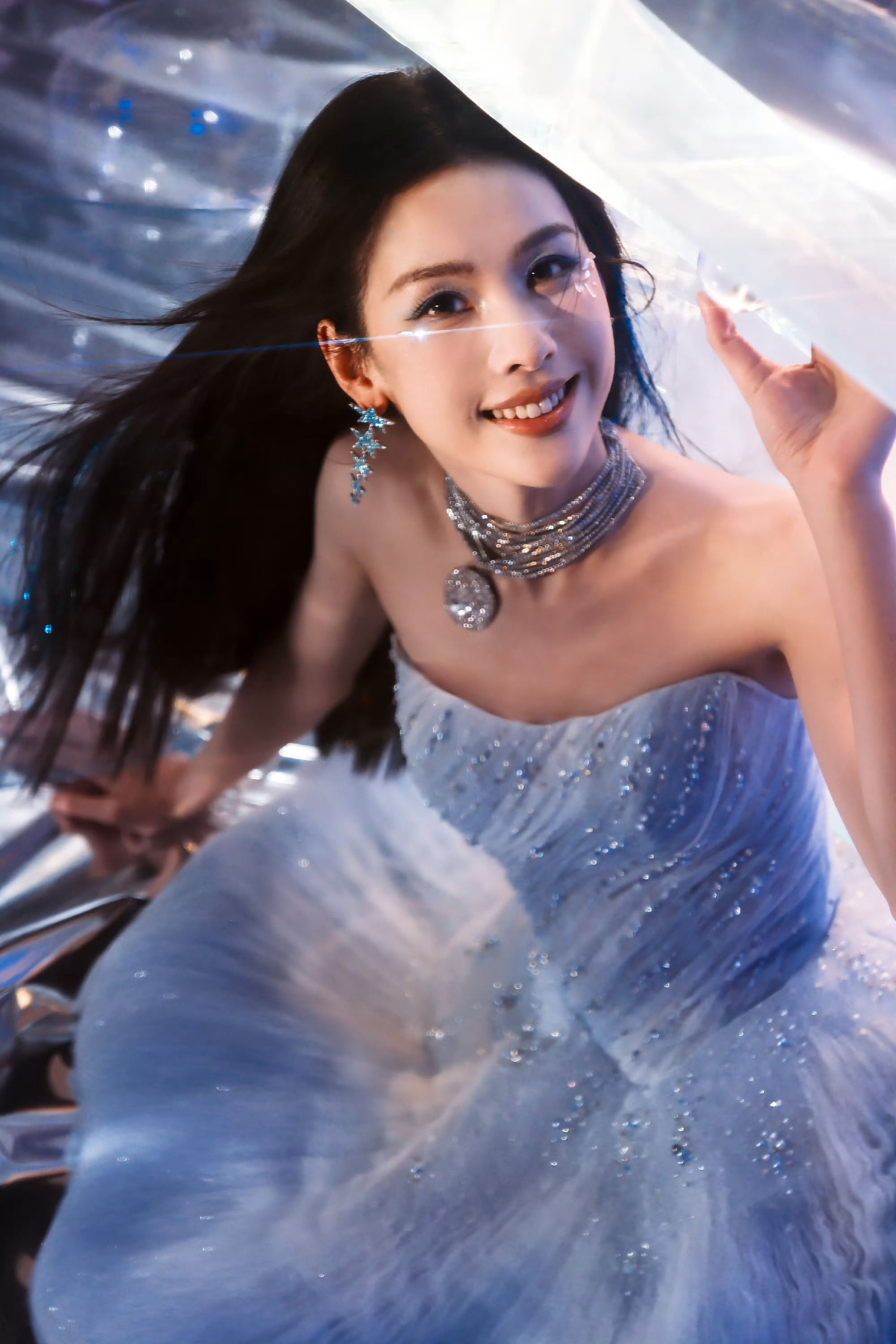 陈都灵|今日活动造型出图,亮片浅蓝色礼裙搭配蓝色挑染长发,配以夸张项链,又灵又美!梦幻女神不过如此了🧚
