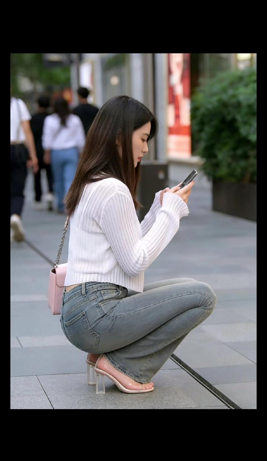 都市时尚女孩,蹲坐街头,沉浸手机世界,粉色包包点缀,时尚穿搭指南。都市时尚女性
