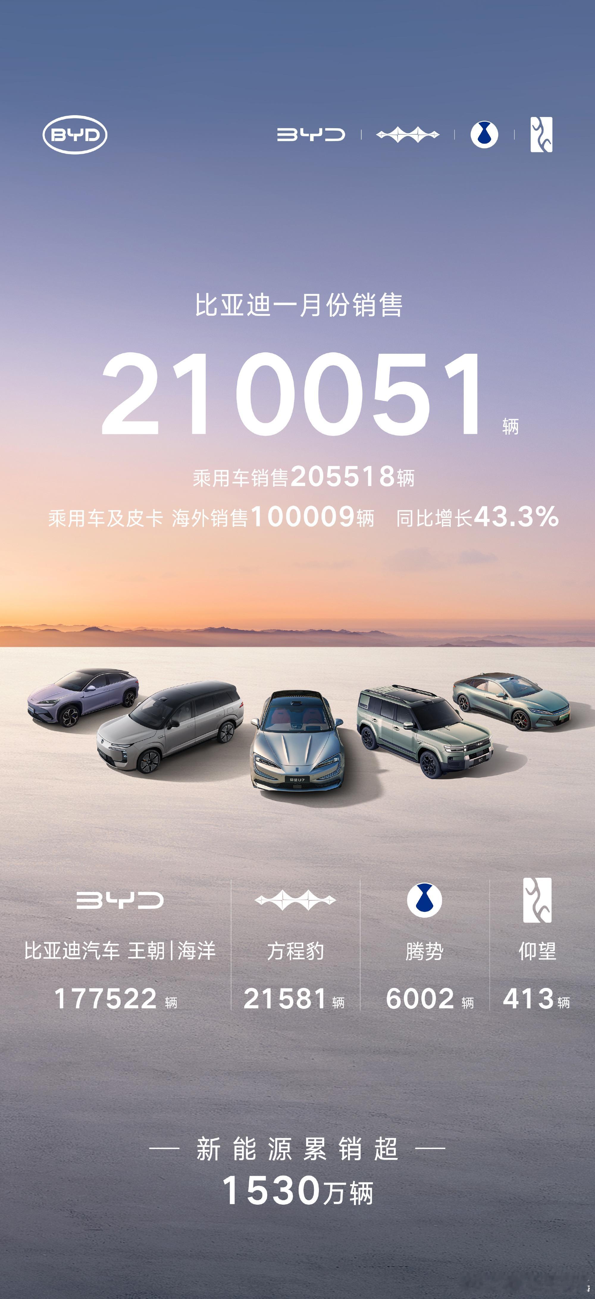 比亚迪1月份销售210051辆;乘用车及皮卡海外销售100009辆。2025年比亚迪海外销量突破100万台,2026年有望达到180万台。到时候,比亚迪将成为国产车企出海第一,点赞~