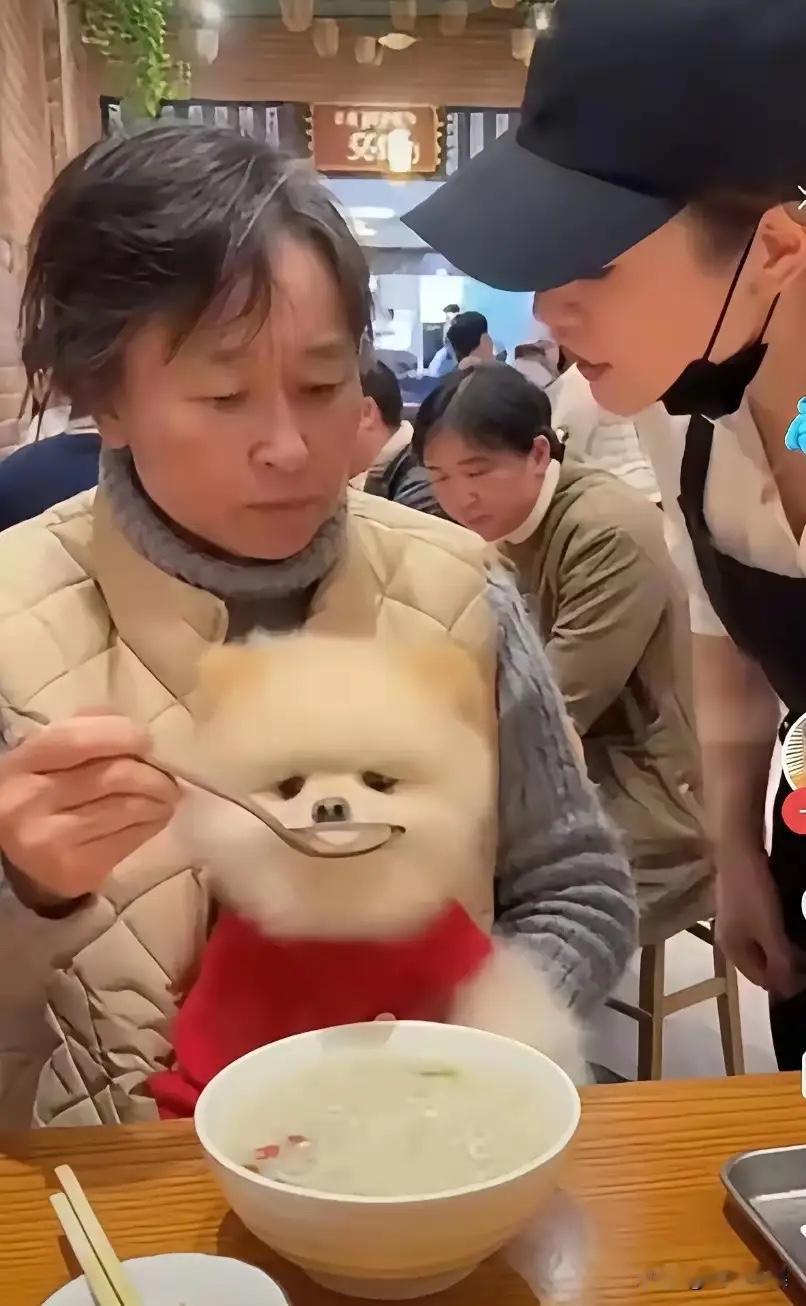 一位大妈到饭店吃饭,令人吃惊的是,她竟然用勺子给狗喂饭。服务员看到了,马上来劝阻