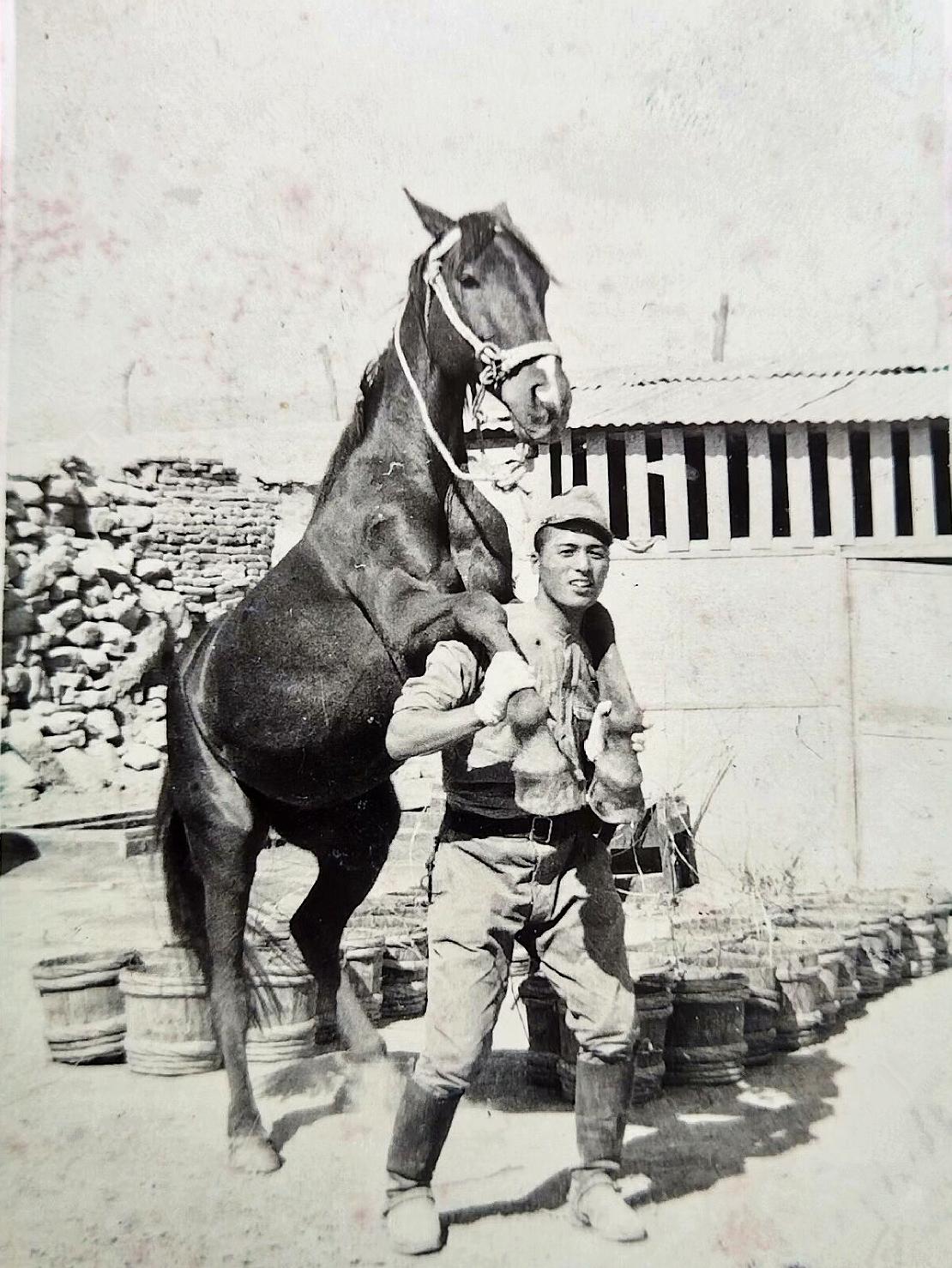 这是一张有趣的照片,一名日军骑兵和一匹战马的合影。这名日军士兵玩心真大,竟然把这匹马的两只前脚搭在自己的肩膀上,难道就不怕这匹马飞起来踢一脚?你看这匹马这么高大,肌肉这么发达,估计可以把这个日军兽兵踢飞几米远。