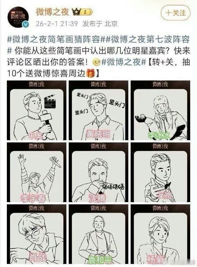 微博之夜第七波阵容第一批:邓超、黄渤、惠英红、李少红、舒淇、王一博、姚晨、杨幂、张艺谋!第二批:申奥、黄晓明、李冰冰、李宇春、沈腾、吴京、肖战、(袁和平)、杨紫