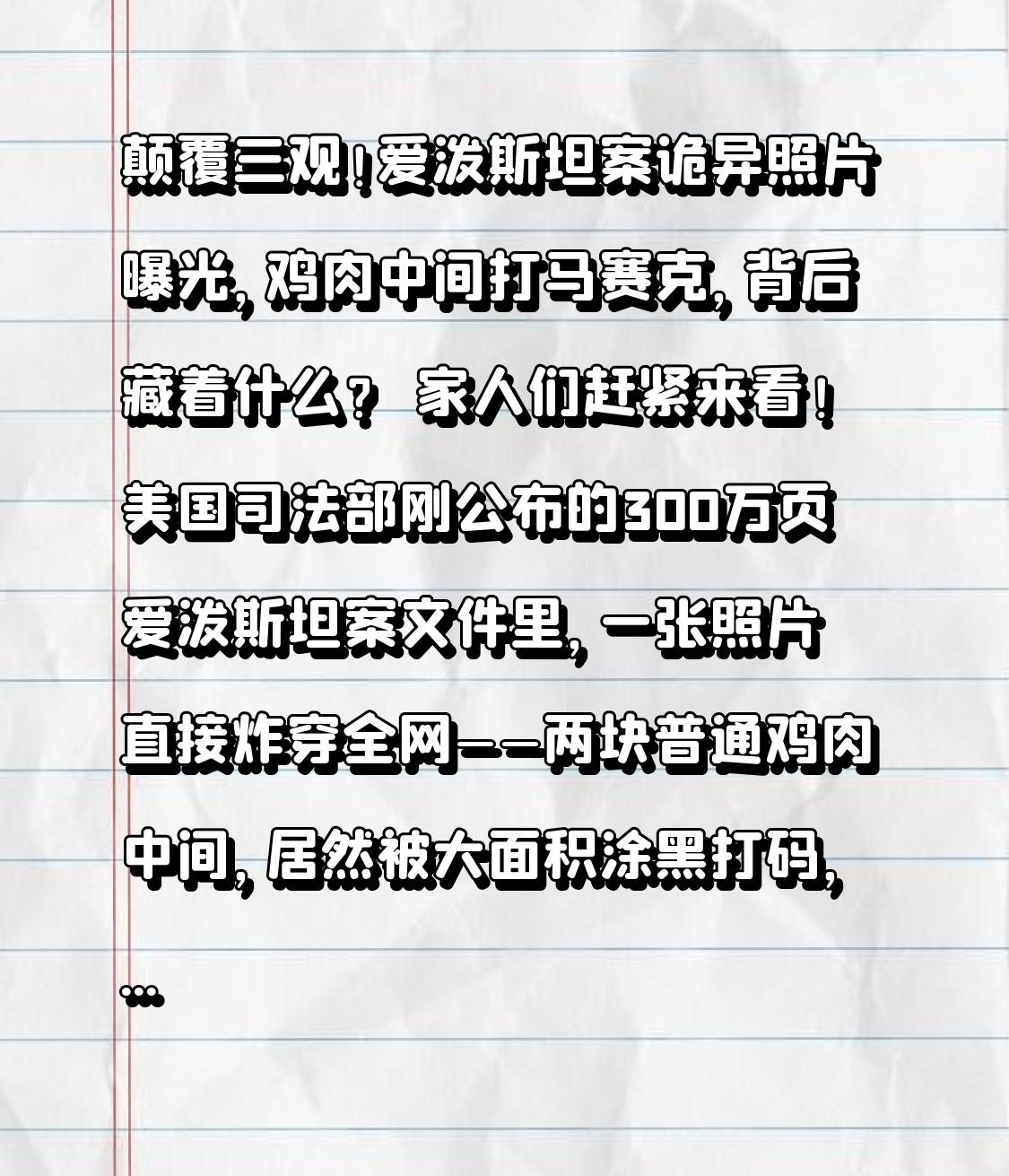 颠覆三观!爱泼斯坦案诡异照片曝光,鸡肉中间打马赛克,背后藏着什么? 家人们赶