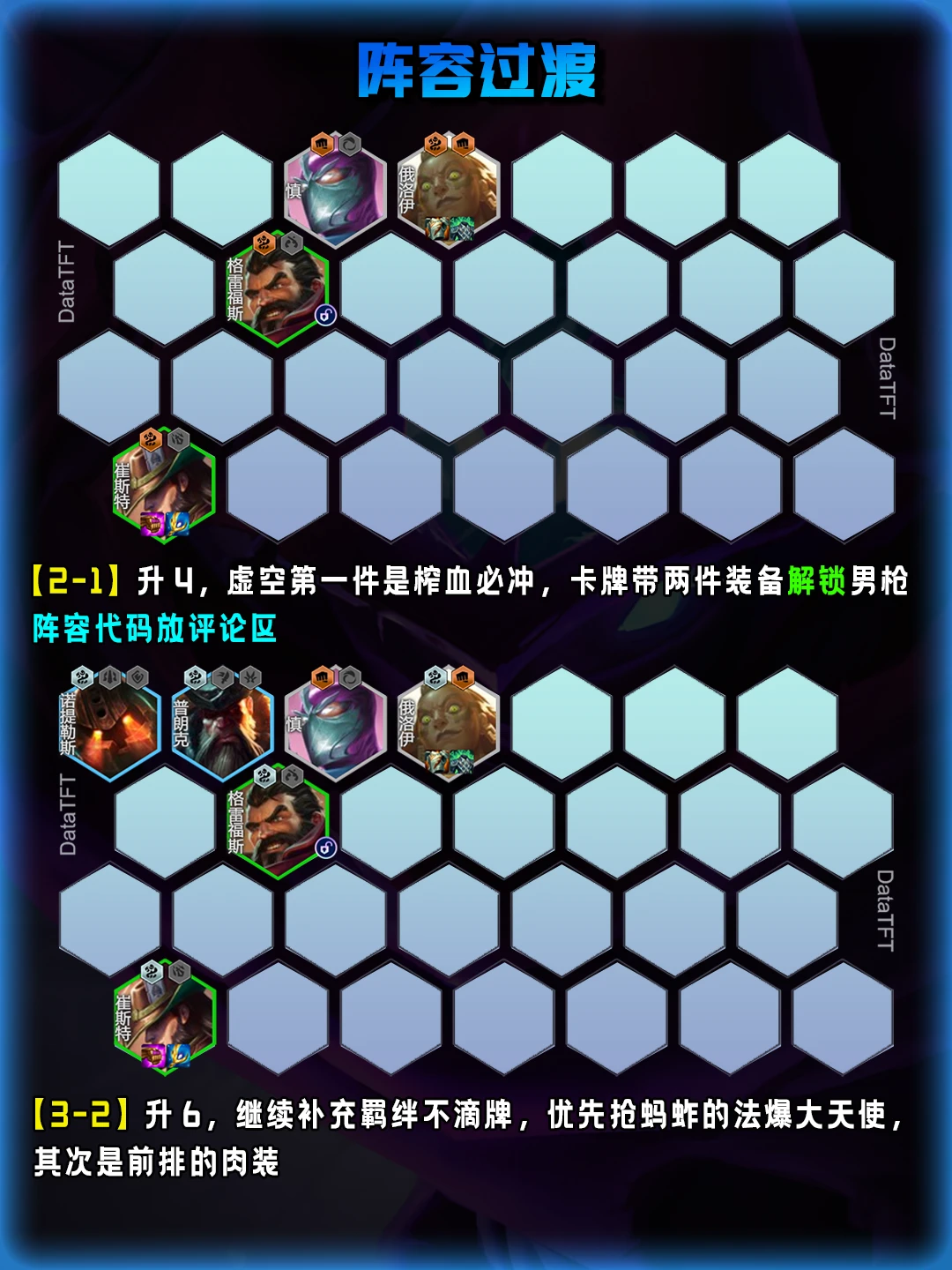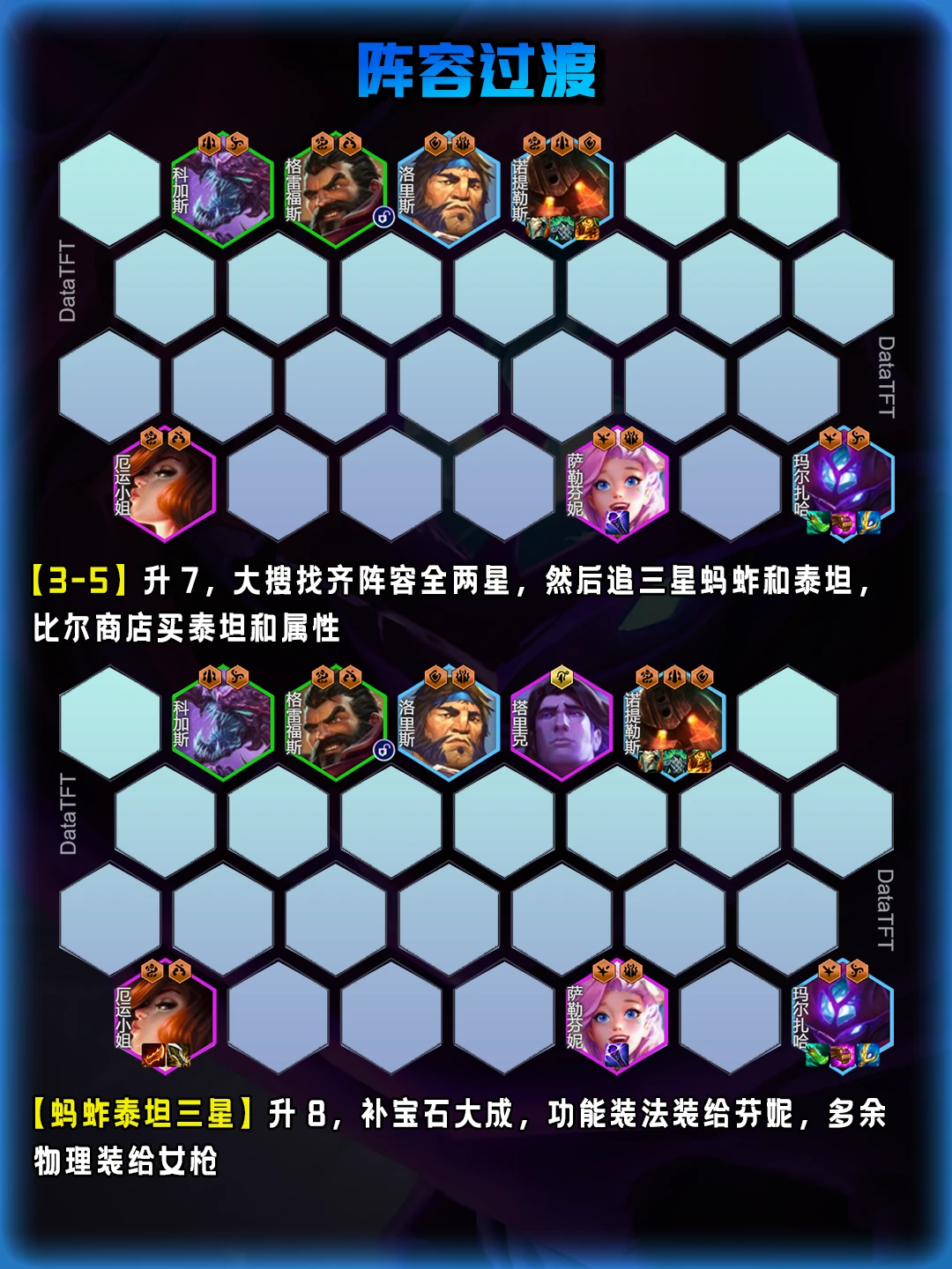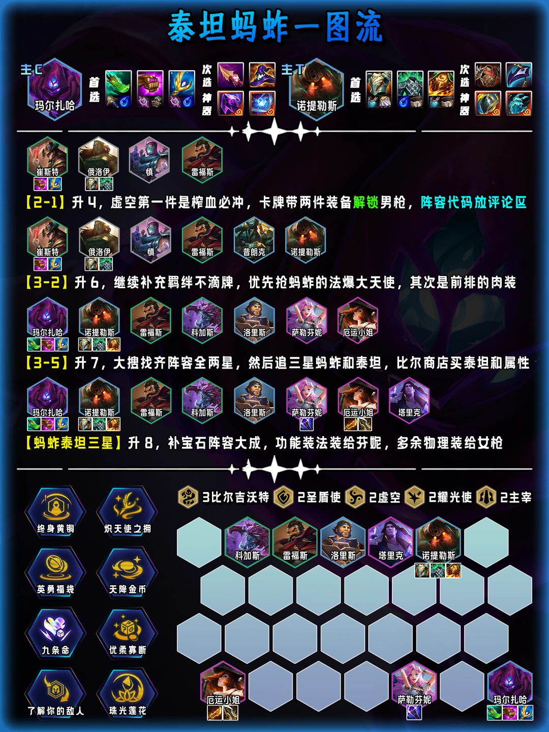 泰坦蚂蚱成型后又肉又有输出,运营还特别丝滑,把把都能吃分! 🌟核心思路 ◽️2-1:升4人口,直接冲虚空羁绊,卡牌带装备过渡,等男枪来直接换 ◽️3-2:升6人口,不D牌,先抢蚂蚱的法爆、大天使,前排肉装也别落下 ◽️3-5:升7人口大搜,先把阵容全员搜到两星,再追三星蚂蚱和泰坦 ◽️最终成型:升8人口补宝石,法装给萨勒芬妮,多余物理装给女枪,羁绊直接拉满! ✅比尔吉沃特商店记得买泰坦和属性加成,战力直接起飞